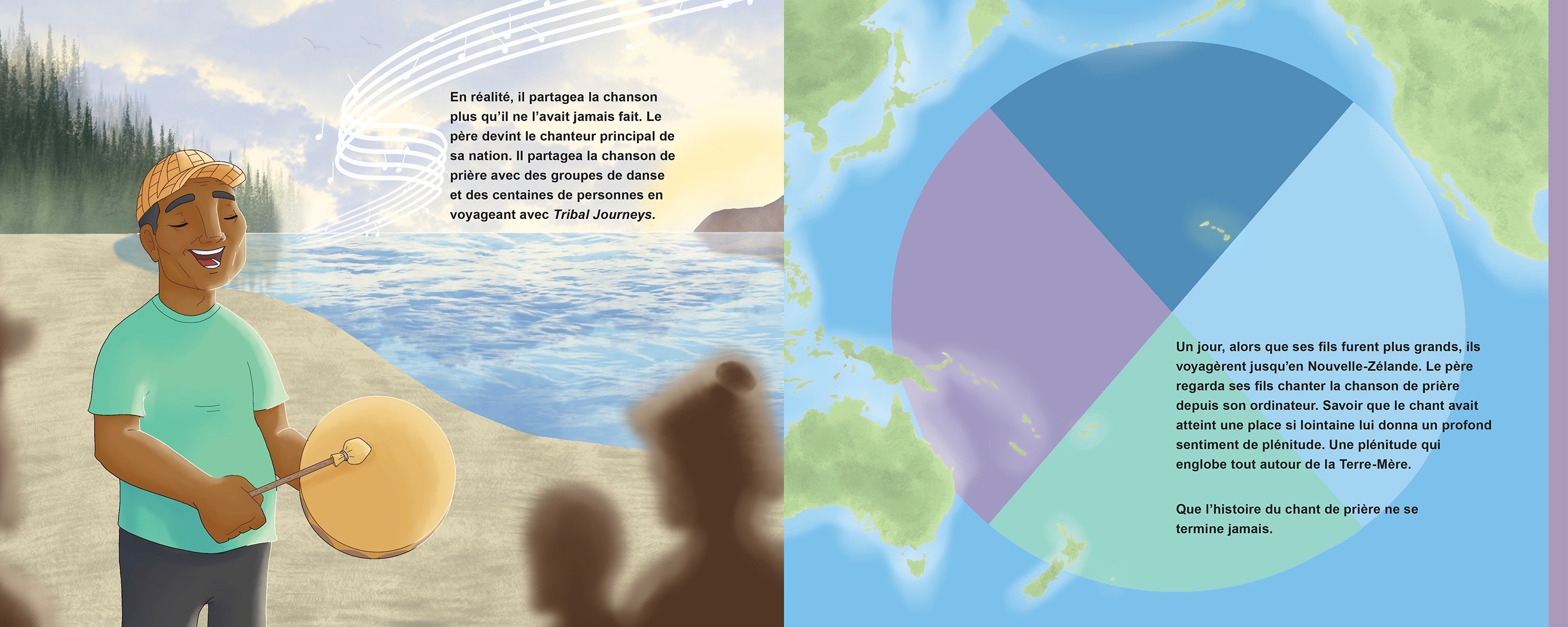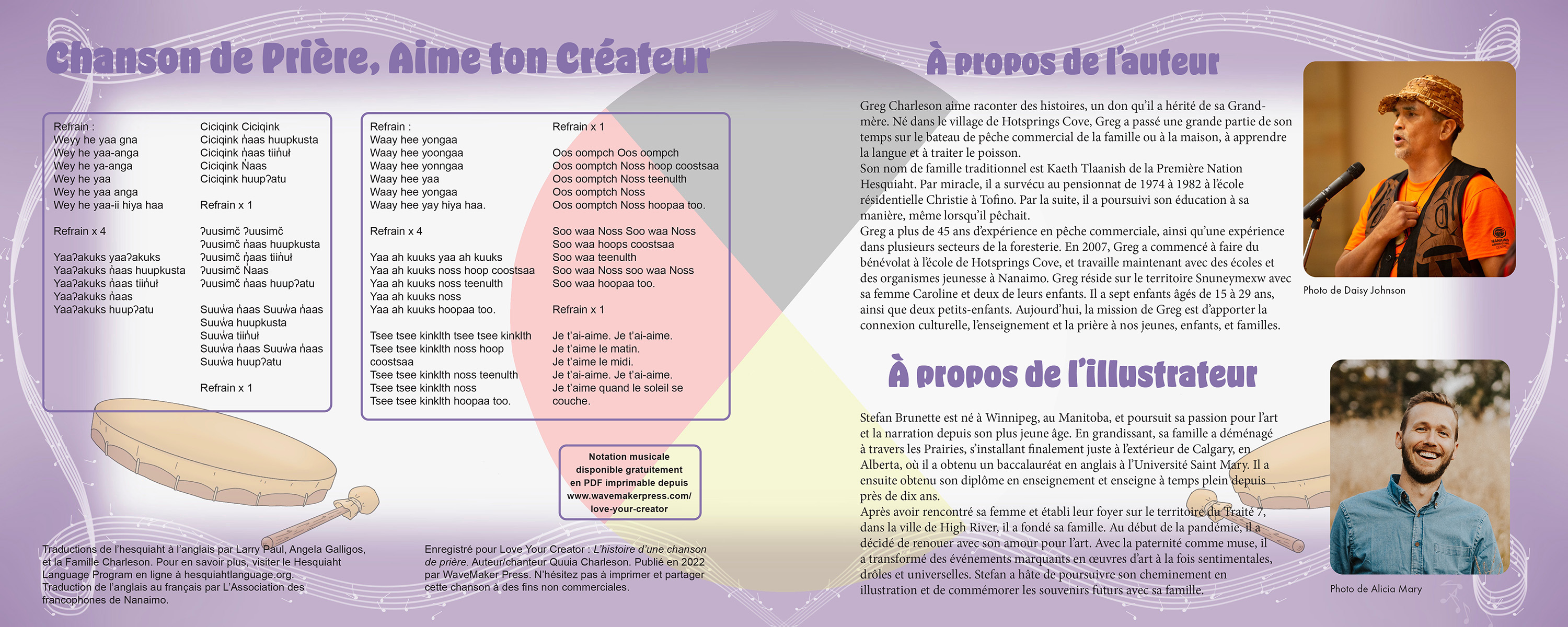 Voici l'histoire vraie d'un chant, autrefois un hymne des pensionnats autochtones. Grâce au soutien de sa famille et de sa communauté, et notamment à la détermination de son fils et aux encouragements de sa grand-mère, Quuia Charleson (Nuu-Chah-Nulth), gardienne du savoir, s'est réapproprié le chant Aime ton Créateur et continue de le transmettre oralement, ainsi que son histoire, lors d'événements et de voyages. Les illustrations saisissantes de Stefan Brunette donnent vie avec passion aux personnes et aux événements qui ont inspiré ce chant.