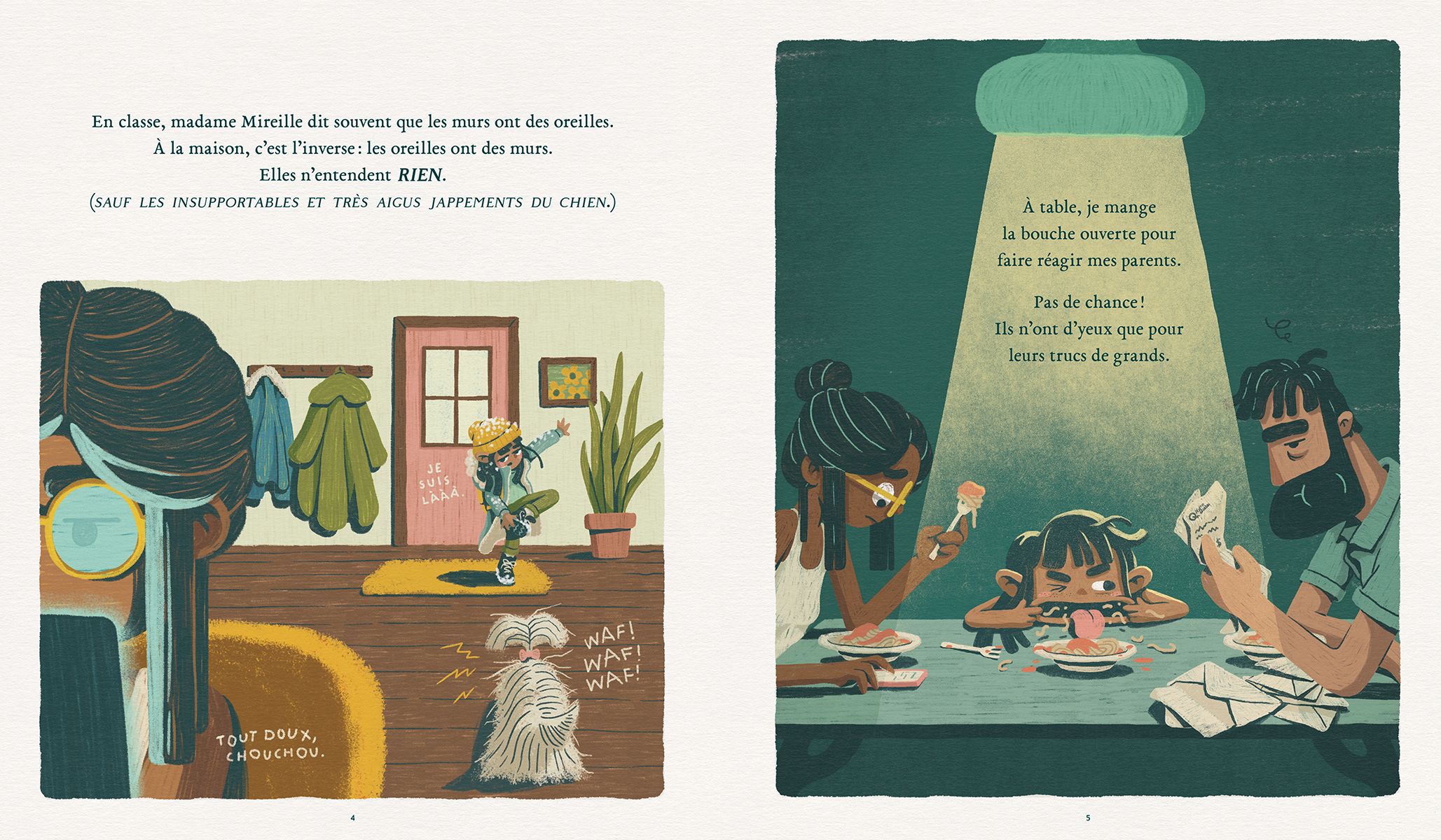 «Moi, quand j’ai lu cet album pour la première fois, j’en ai eu des frissons. Parce que même si dans l’album on est vraiment triste pour Blanche, — parce que c’est un peu intense ses parents — on peut se reconnaître […] en tant que parent dans ces comportements-là, parce que même si on ne veut pas mal faire, on est souvent sur notre téléphone à répondre, puis on a toujours une bonne raison. Et je dis pas qu’on peut faire tous nos trucs d’adultes quand nos enfants sont couchés, parce que parfois ça n’a pas de sens, […] mais peut-être juste de réaliser qu’eux voient les choses différemment. Puis de peut-être gérer notre vie d’adulte un peu différemment, pour pas qu’ils se sentent comme Blanche, invisibles, finalement.»
