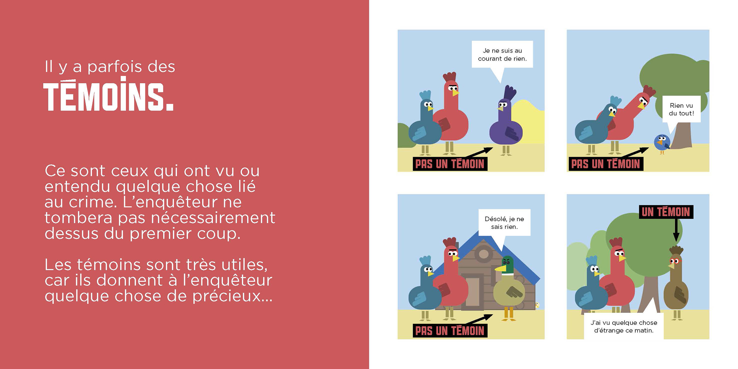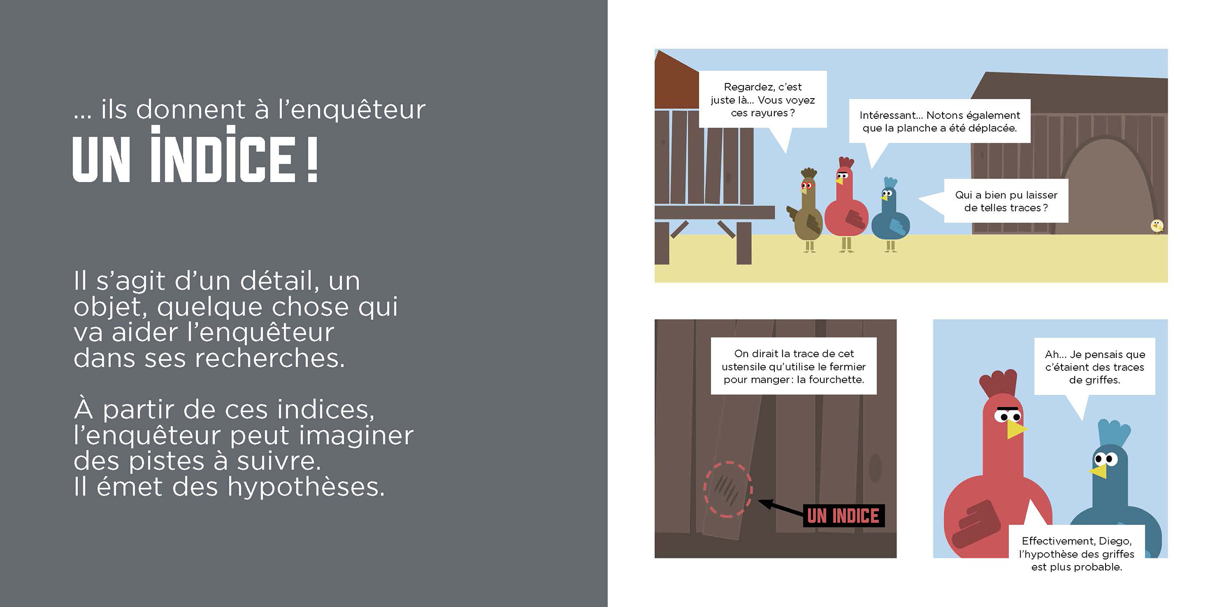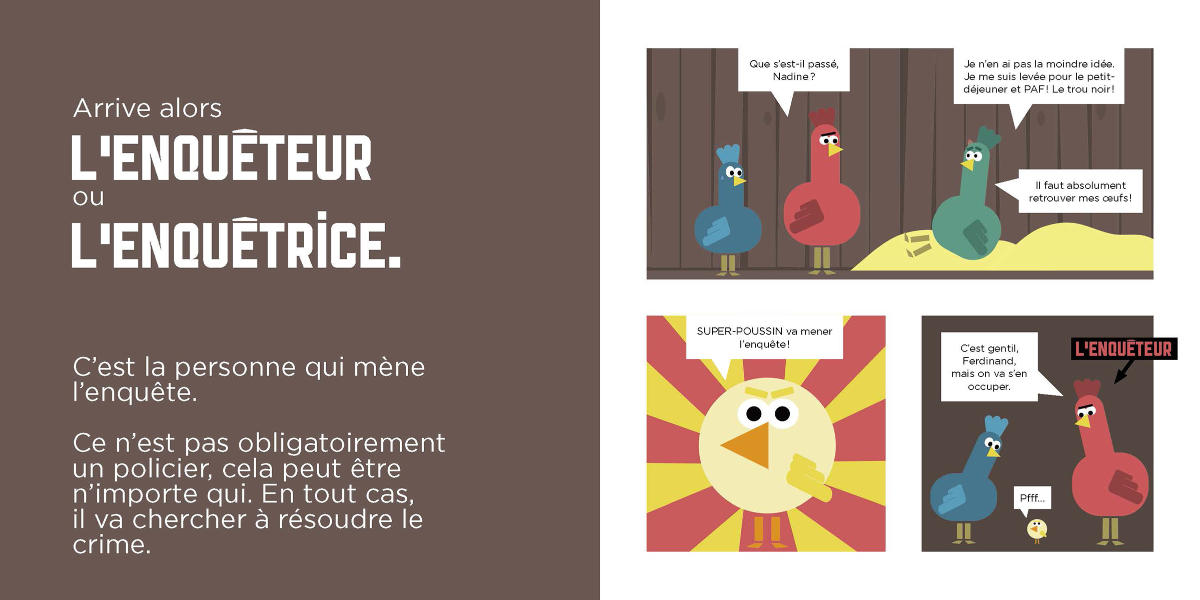 Après Comment ça marche, un conte ?, Olivier Dupin nous revient avec Comment ça marche, une enquête ? Armé de son humour et de son talent de vulgarisateur, il explique aux jeunes lecteurs de quoi est constitué tout bon récit d’enquête. Du crime à la découverte du coupable, en passant par les indices, les hypothèses, les suspects et les alibis, on suit Jim et Diego dans leur démarche. Ainsi que Ferdinand sans qui nos deux enquêteurs auraient pu piétiner longuement à la recherche des oeufs volés. Un album qui donnera certainement aux lecteurs l’envie de prendre à leur tour le crayon et de créer leur propre récit d’enquête.