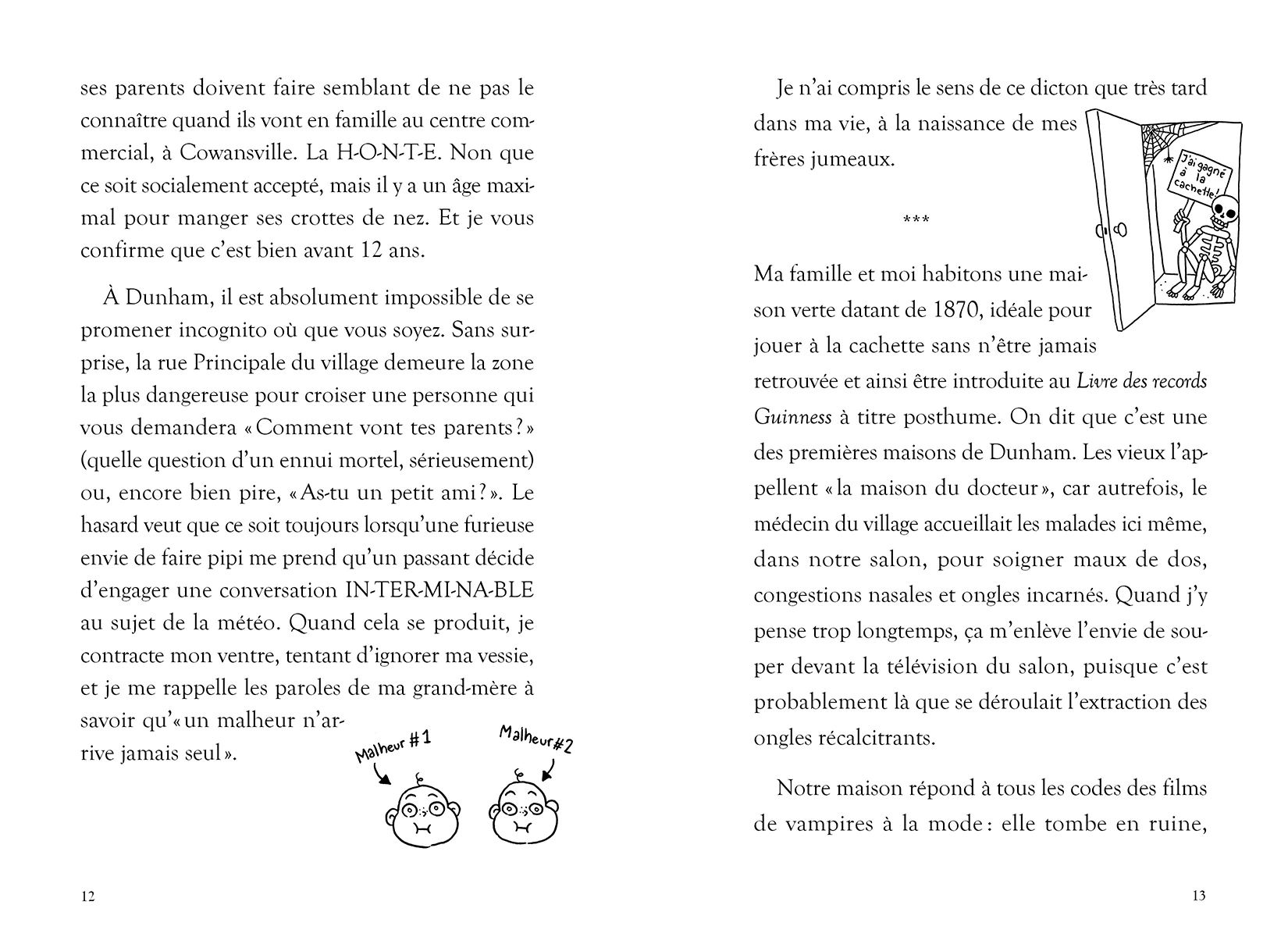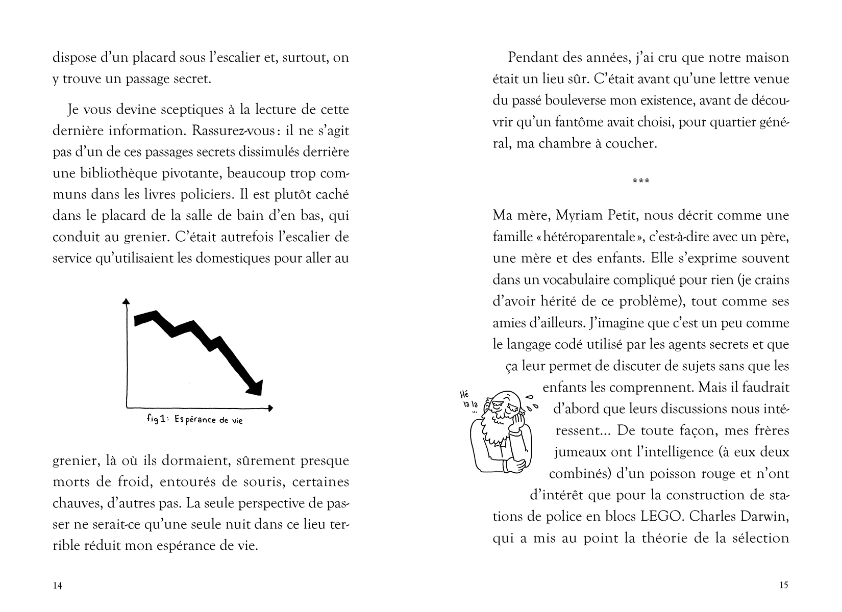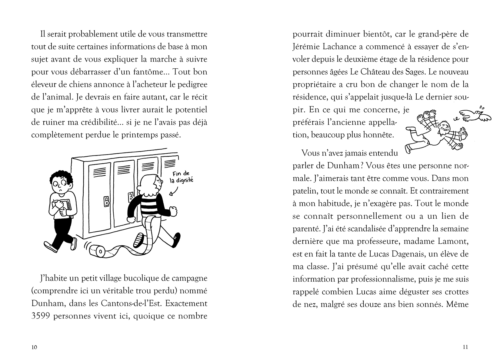 Dans le village où je vis, moi, Dorothée Petit, je jure qu’il ne se passe jamais rien. Enfin, jusqu’au jour où mon père découvre une vieille boîte dissimulée dans le mur de la cuisine. À l’intérieur : une photo à donner froid dans le dos, un mouchoir douteux et une lettre d’une certaine Doris, datée de 1895. Même âge que moi, même chambre, mêmes frères jumeaux épuisants. Troublant, non ? Depuis, ma fenêtre s’ouvre toute seule, des objets se déplacent durant la nuit… et je ne dors plus. Génial. Heureusement, j’ai le soutien de la Société d’histoire du village – un club sélect de passionnés de vieux trucs – pour m’aider à élucider une question toute simple : comment fait-on pour convaincre un fantôme de déménager ?