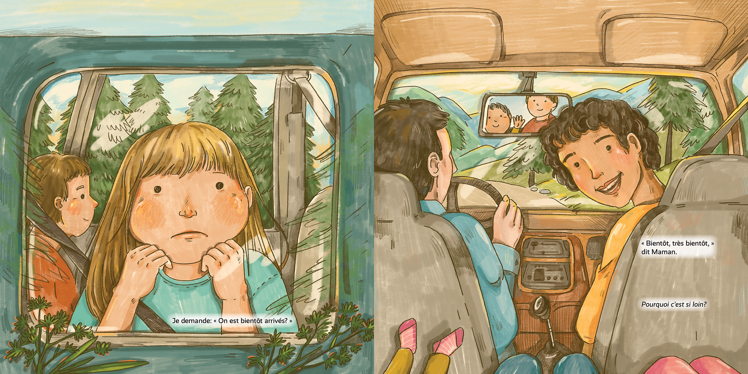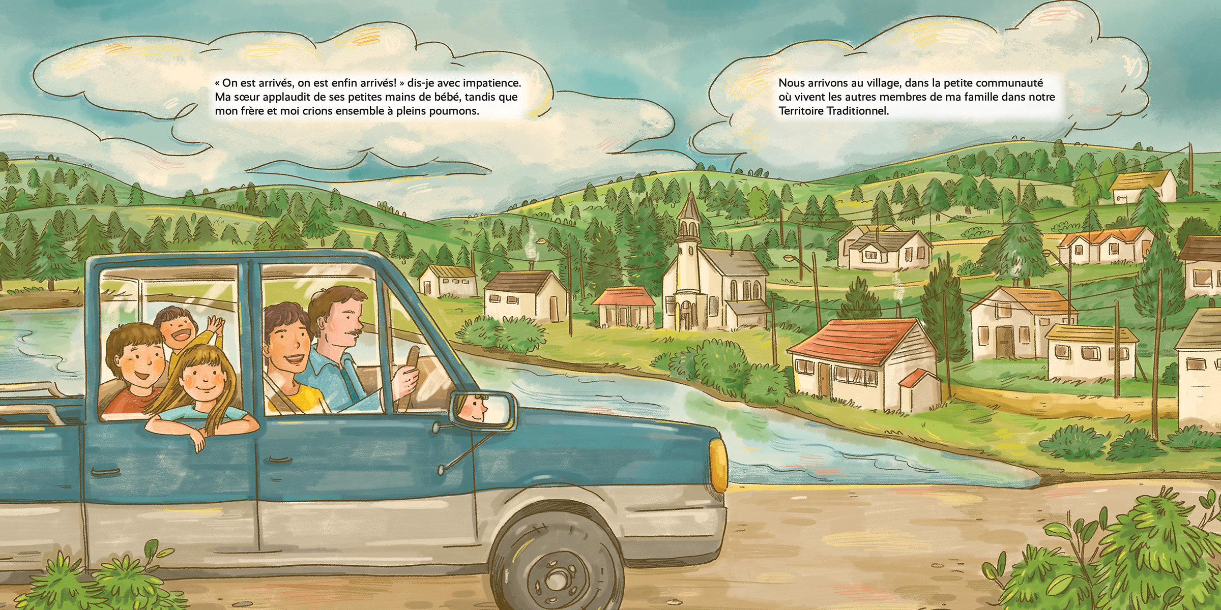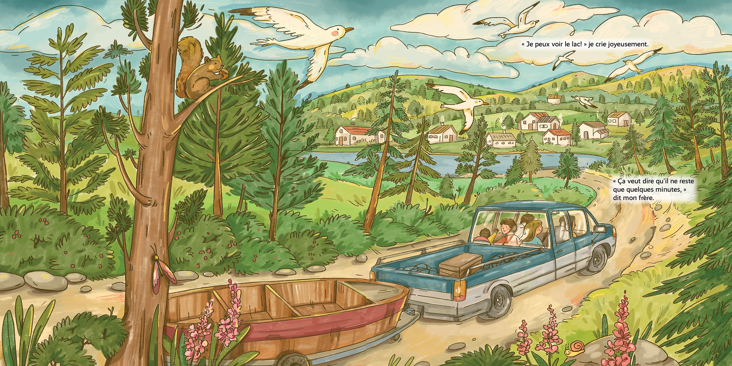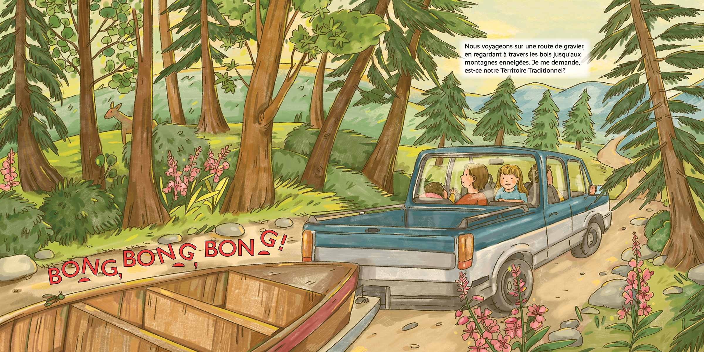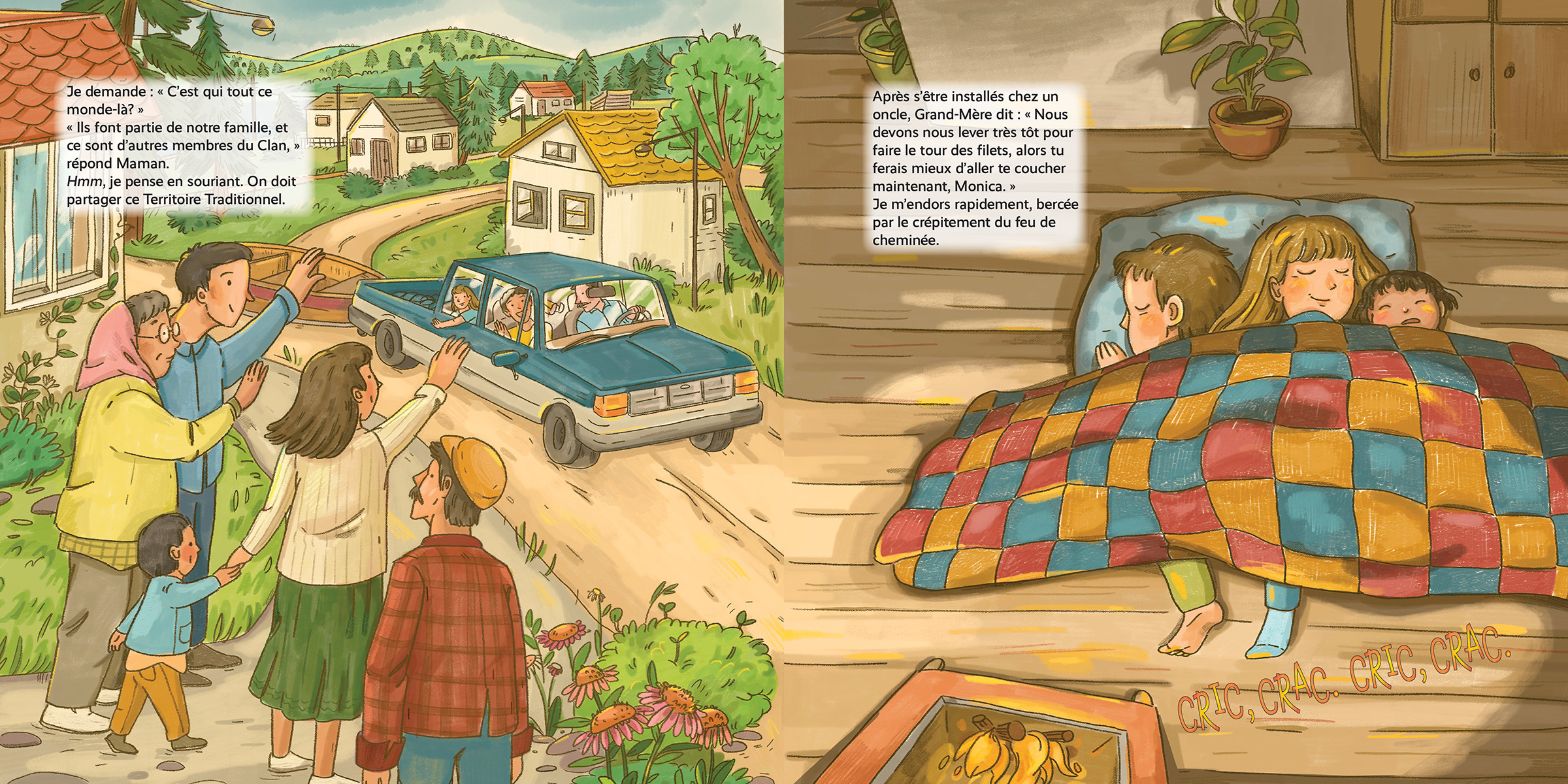 Sur la rivière, le castor claque sa queue, les saumons nagent, et une famille remonte sa pêche.