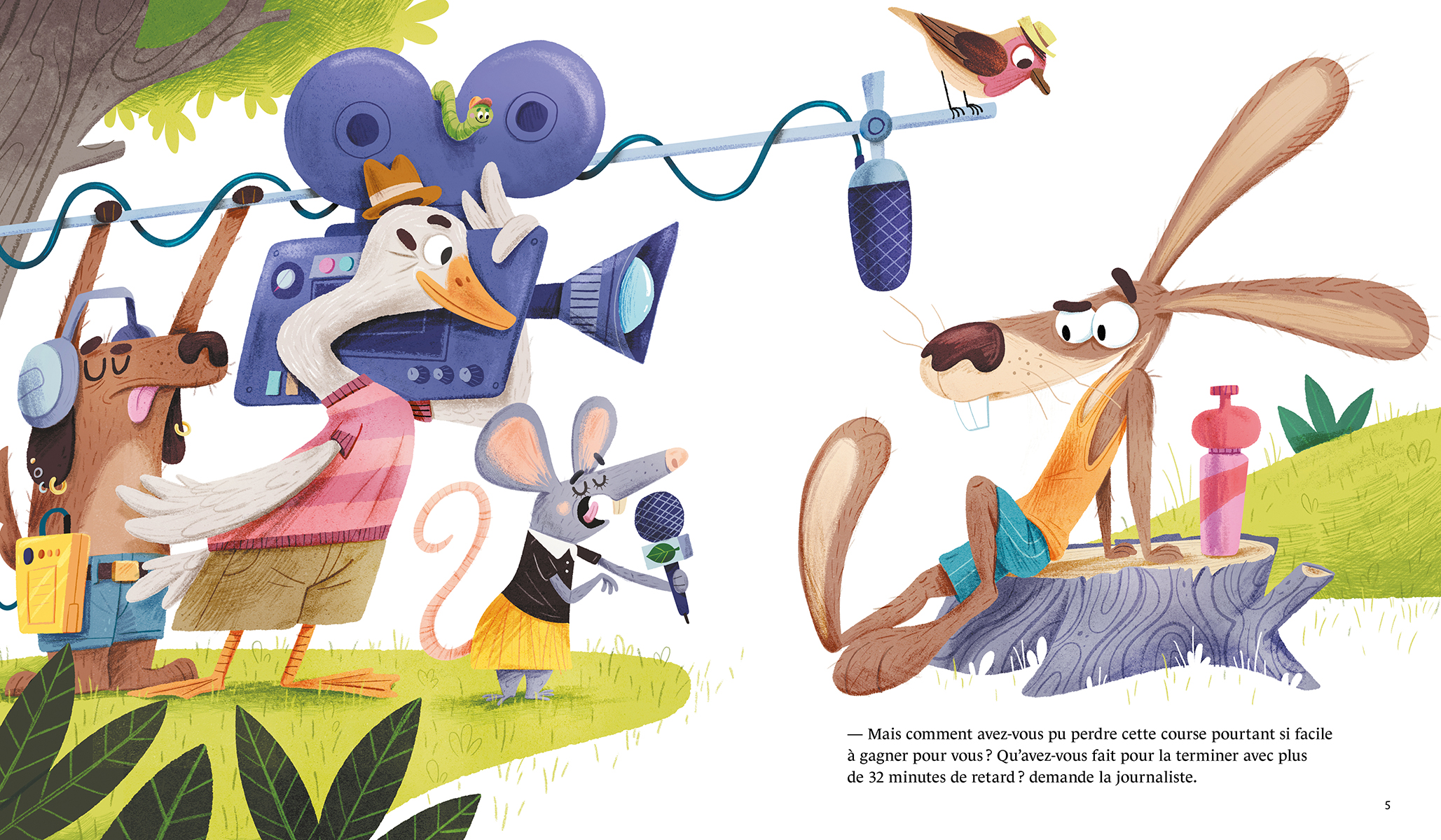 Dans cet album désopilant, Robert Soulières s’attaque à la fable Le lièvre et la tortue avec son sens de l’humour bien distinctif ! Le texte, écrit de la perspective du lièvre qui se fait interviewer après sa défaite, donne une nouvelle saveur à cette histoire maintes fois racontée. Les personnages expressifs et les décors aux couleurs vives de Sans Cravate ne pourraient pas être mieux agencés à cette histoire farfelue !