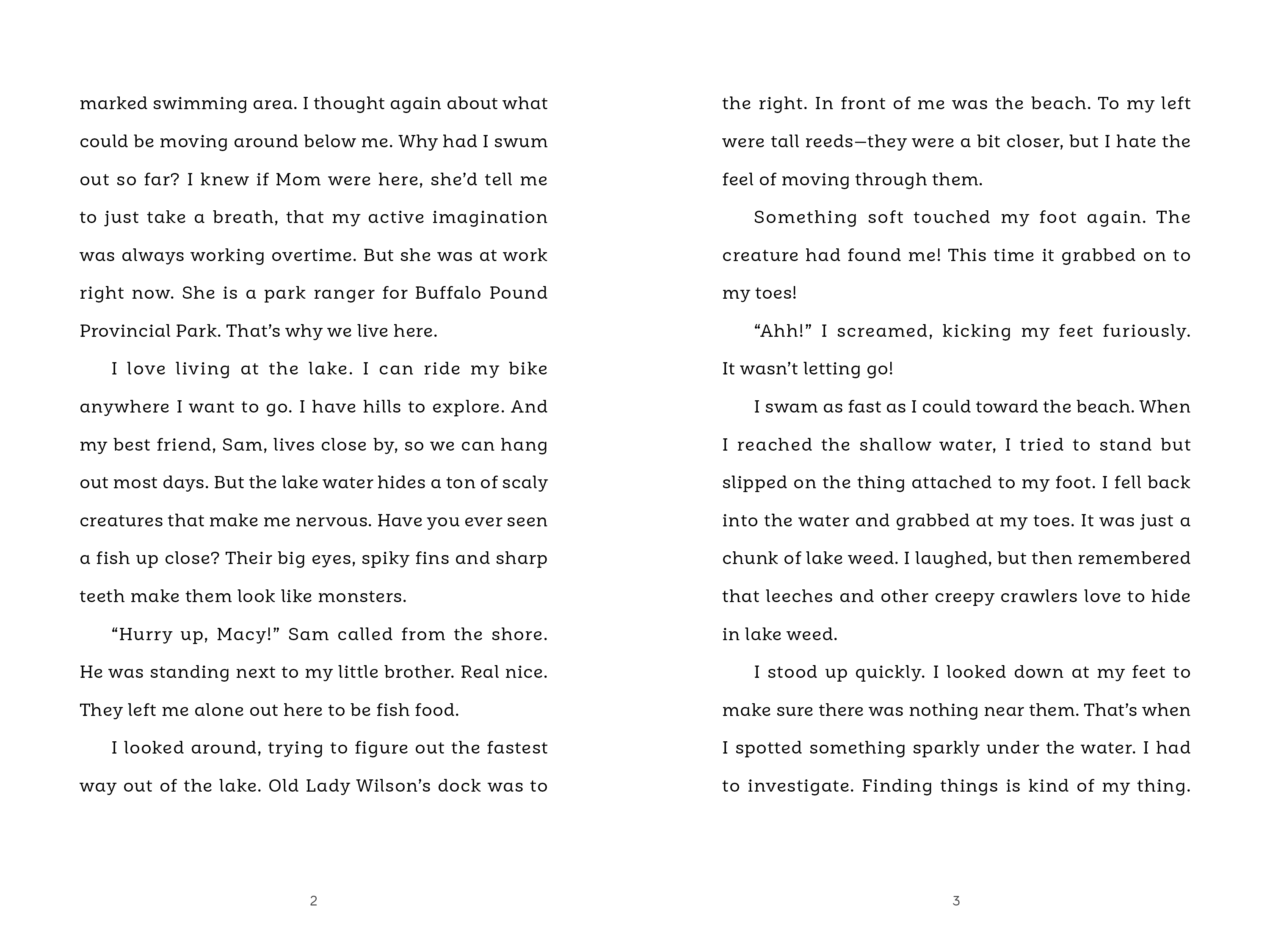 Twelve-year-old Macy is an amateur treasure hunter who finds lost things along the southern Saskatchewan shores of Buffalo Pound Lake.