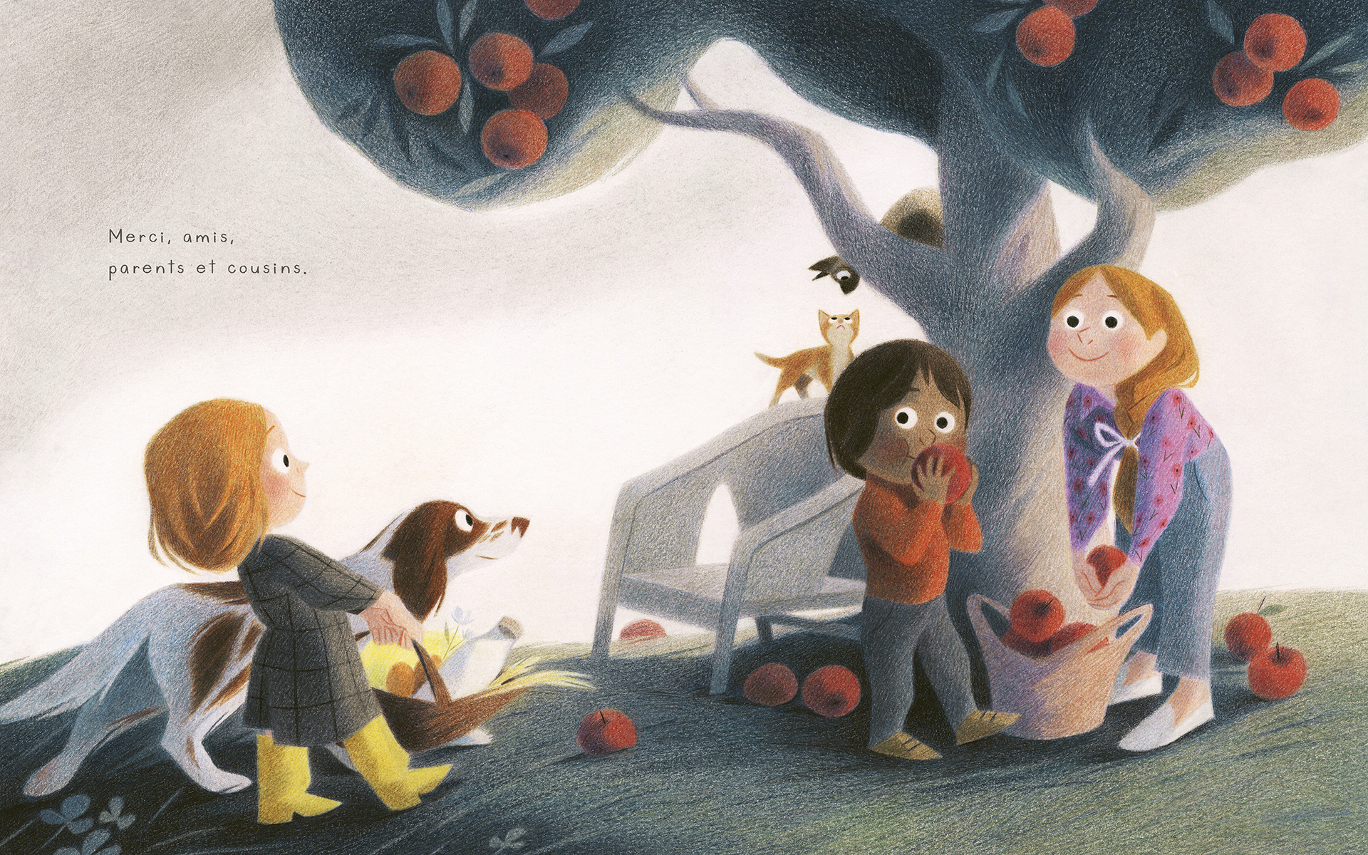 « Le texte minimaliste est magnifié par les superbes illustrations qui se déploient sur la double page et qui, à leur tour, donnent tout leur sens aux remerciements de la fillette. Sous les pastels et les crayons de couleur de Geneviève Godbout, la nature se pare d’un aspect légèrement vaporeux empreint d’une grande douceur, qui met en valeur la faune et la flore finement dessinées. Véritable ode à la nature, cette histoire transmet le respect et la reconnaissance de la terre nourricière. Elle conscientise les enfants sur l’origine des aliments qui se retrouvent dans leur assiette. À souligner, la qualité de la présentation de ce grand album au dos toilé que je ne me lasse pas d’admirer. »