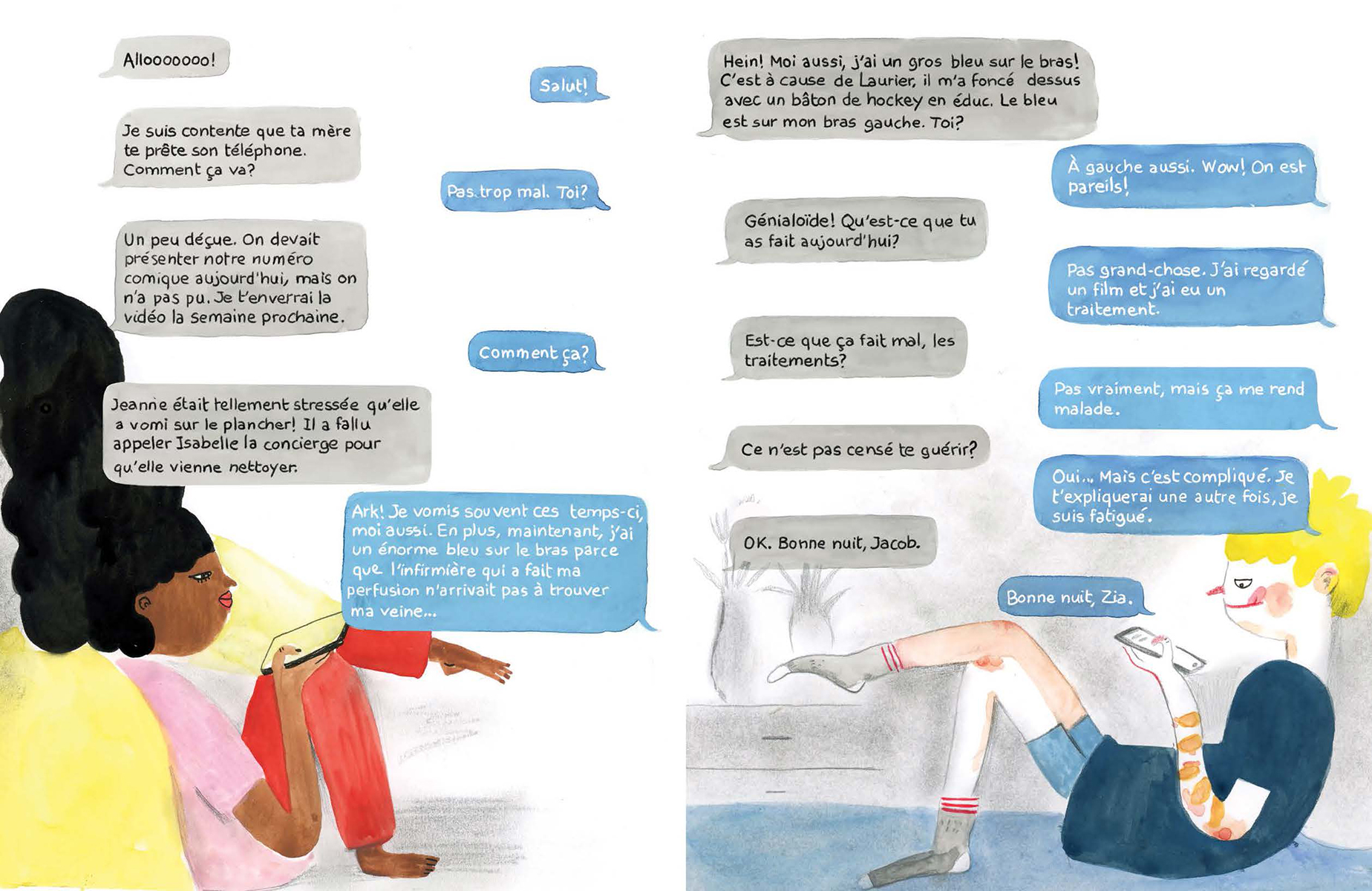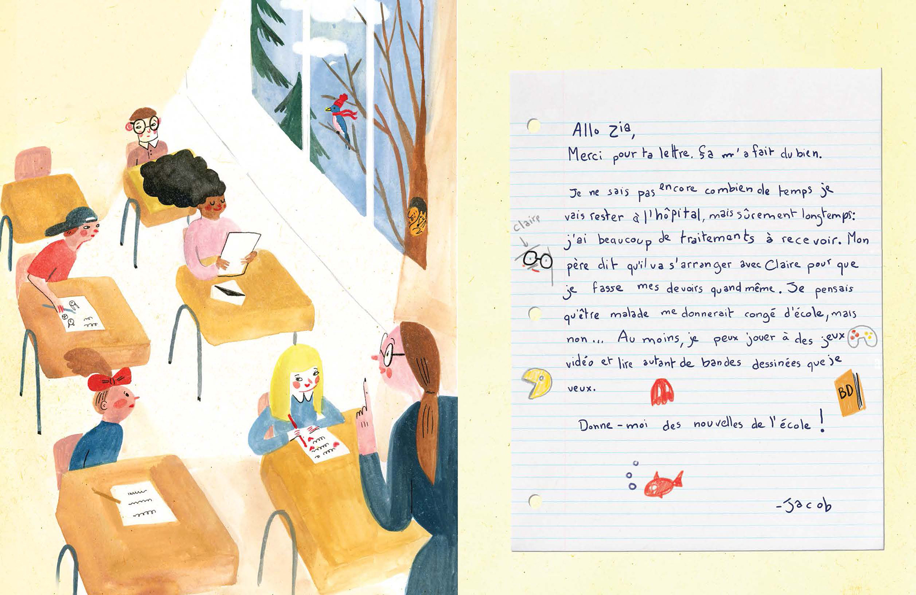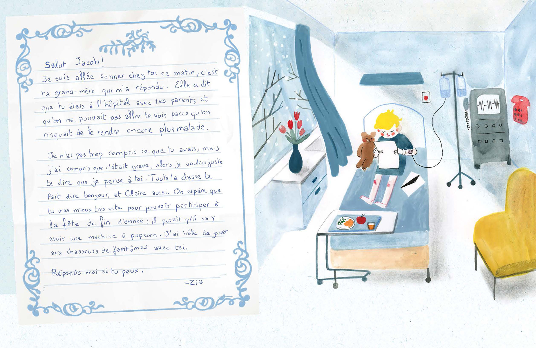 Jacob est atteint d’un cancer et doit rester à l’hôpital. Son amie Zia commence alors une correspondance avec lui. À travers leurs échanges, Jacob se confie sur ce qu’il vit et Zia lui raconte ce qui se déroule en classe. On y découvre alors leur réalité respective, leurs craintes, leurs apprentissages et le chemin à parcourir vers la rémission. Maude Nepveu-Villeneuve livre une oeuvre à hauteur d’enfant, toute en sensibilité et en nuances sur un sujet plus que délicat, le cancer infantile. Malgré la délicatesse du thème, l’autrice offre une oeuvre lumineuse, mise en images avec brio par Agathe Bray-Bourret.