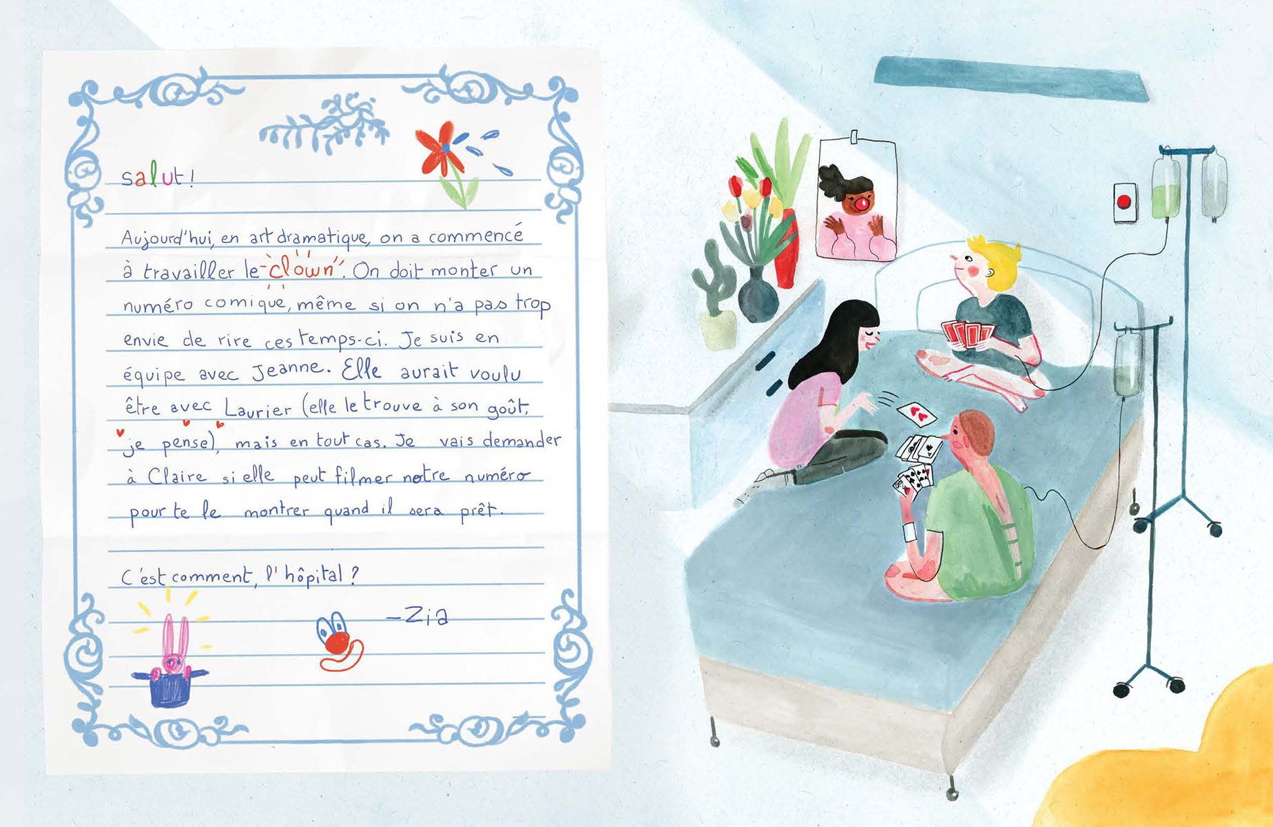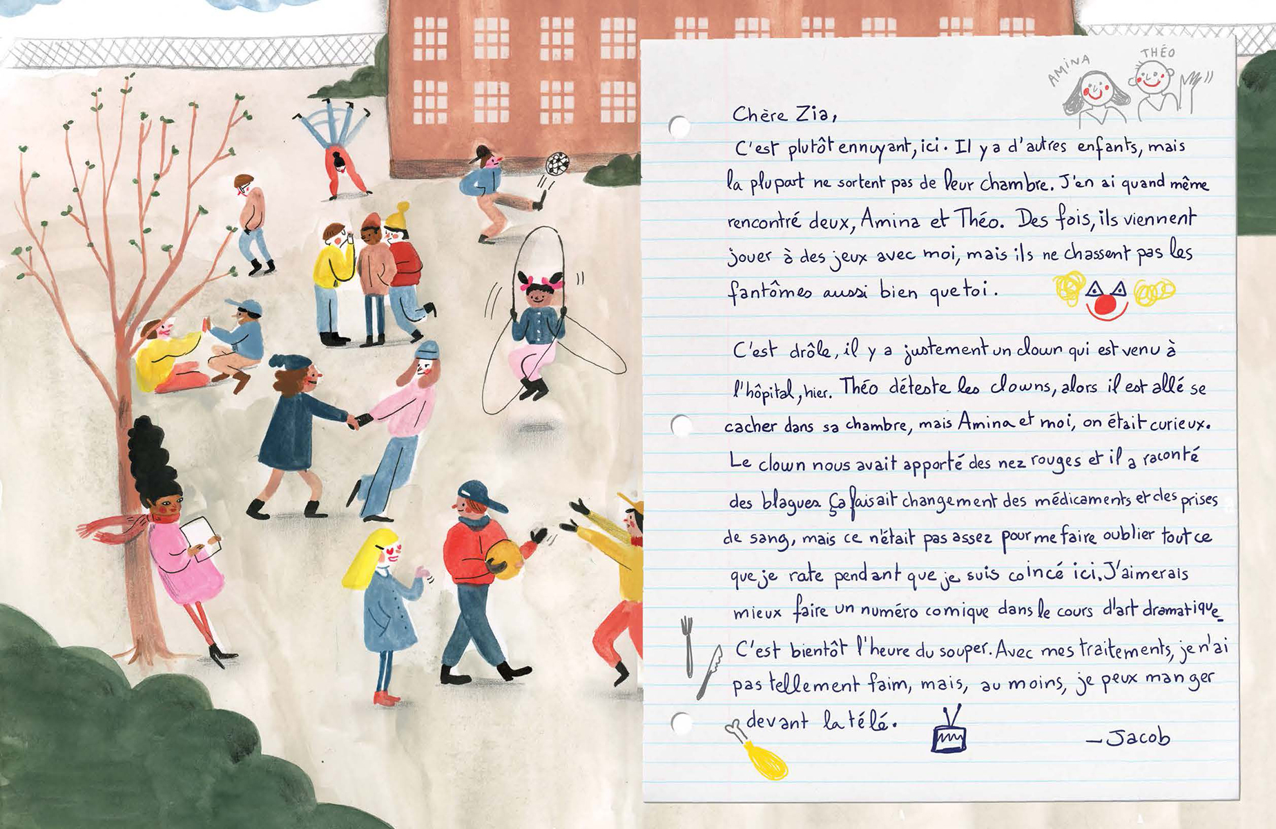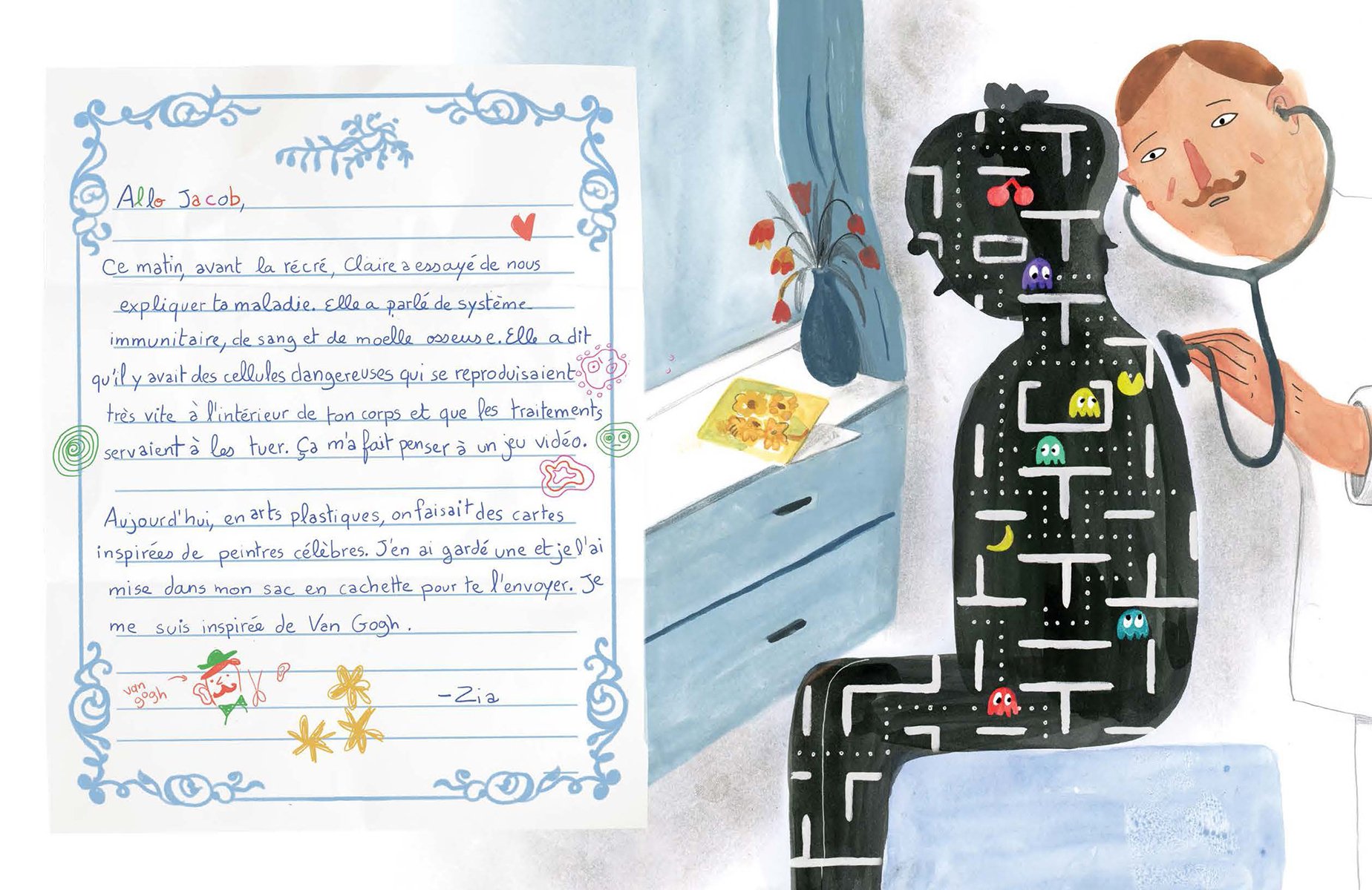 Jacob est atteint d’un cancer et doit rester à l’hôpital. Son amie Zia commence alors une correspondance avec lui. À travers leurs échanges, Jacob se confie sur ce qu’il vit et Zia lui raconte ce qui se déroule en classe. On y découvre alors leur réalité respective, leurs craintes, leurs apprentissages et le chemin à parcourir vers la rémission. Maude Nepveu-Villeneuve livre une oeuvre à hauteur d’enfant, toute en sensibilité et en nuances sur un sujet plus que délicat, le cancer infantile. Malgré la délicatesse du thème, l’autrice offre une oeuvre lumineuse, mise en images avec brio par Agathe Bray-Bourret.