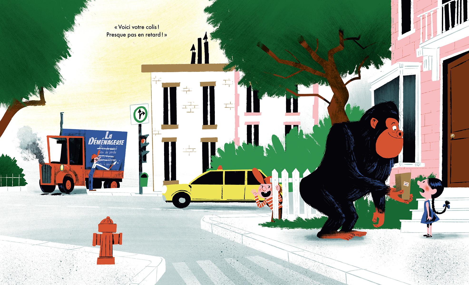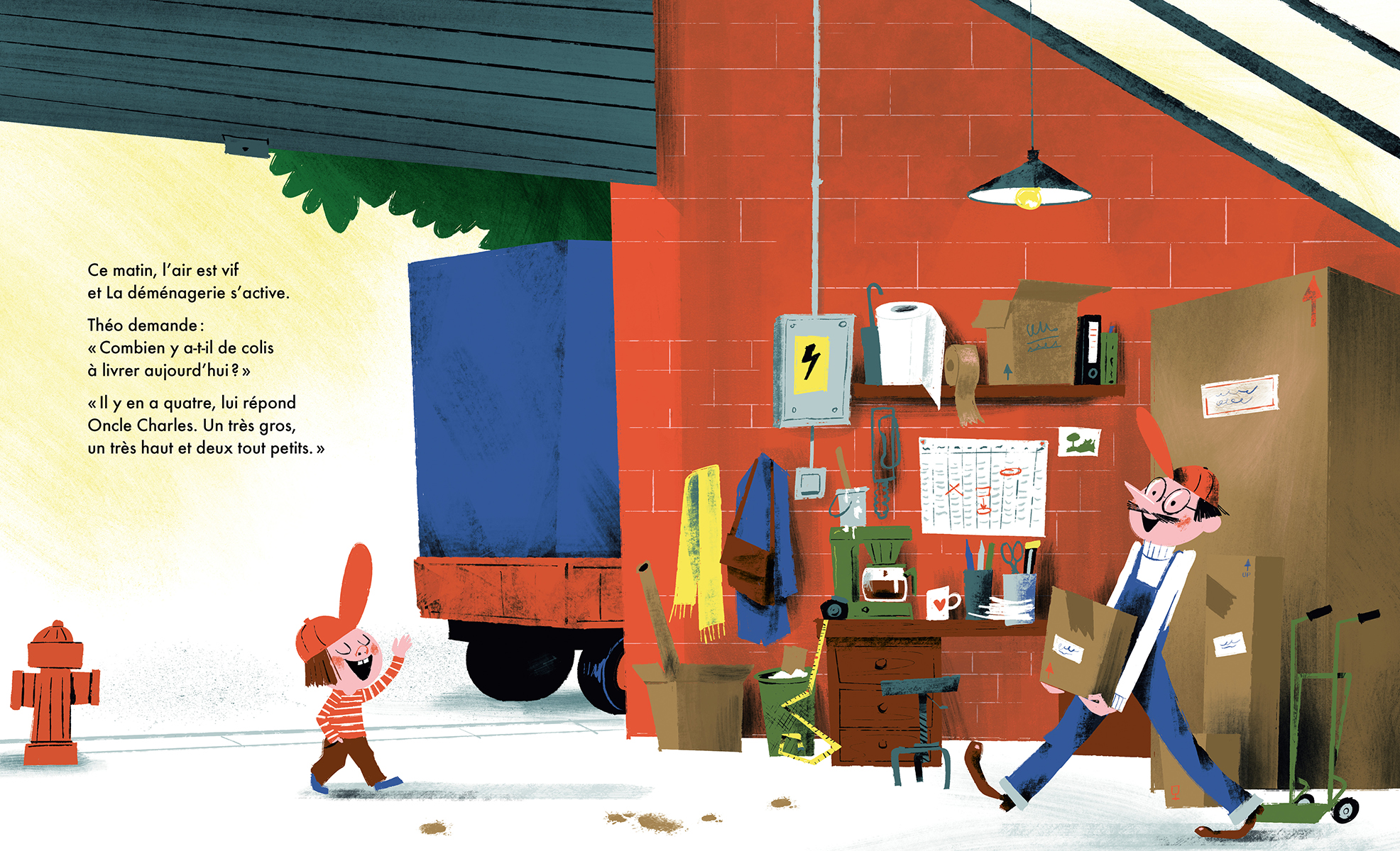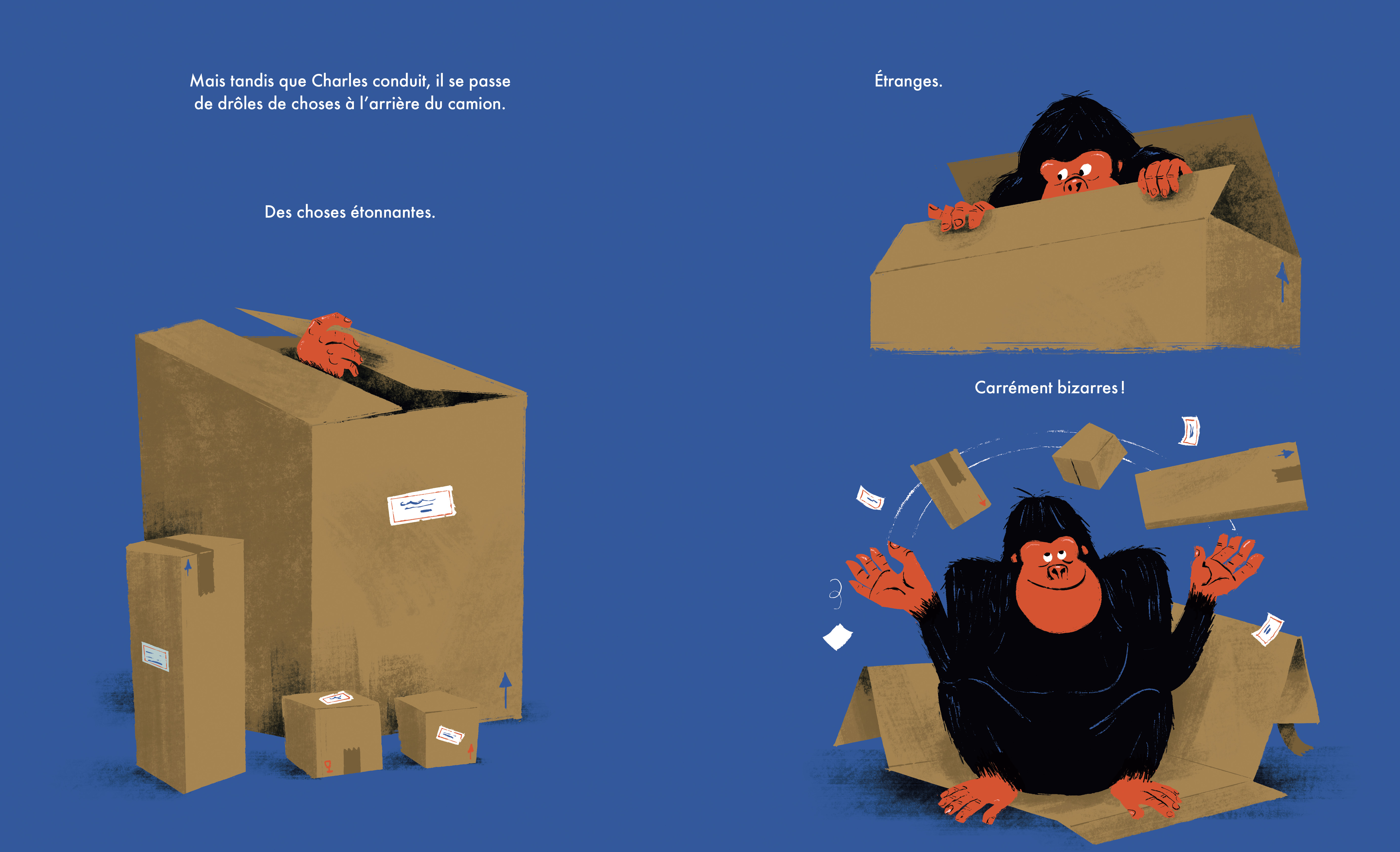 Comme chaque jour, Théo et son oncle Charles se préparent à embarquer à bord de La Déménagerie, leur camion de livraison de colis. À La Déménagerie on livre tous les paquets, coûte que coûte, et avec le sourire ! Leur mission du jour : quatre boîtes à livrer, dont une sur-dimensionnée ! En chemin, un gorille surgit d’une des boîtes et retire les étiquettes sur les trois autres. Catastrophe ! Comment notre duo s’en sortira-t-il pour livrer tous les colis et maintenir leur service impeccable ?