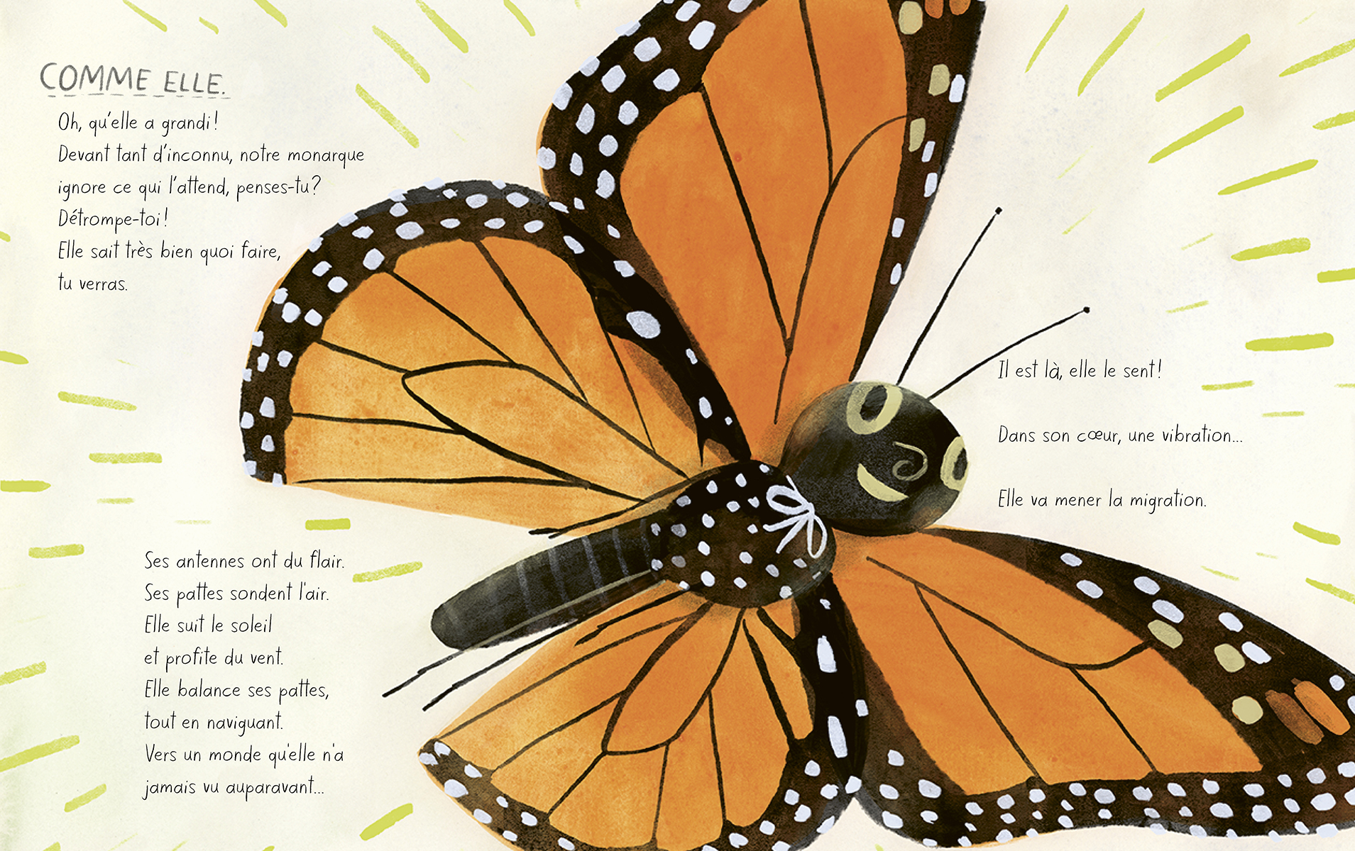 Dans ce magnifique album, Kirsten Hall et Isabelle Arsenault poursuivent leur célébration du monde naturel avec l’histoire fascinante du papillon monarque. Porté par des vers finement travaillés et des illustrations d’une grande richesse, le livre retrace le long et périlleux voyage de ce papillon emblématique. À la fois émerveillant et porteur d’un message essentiel, il invite petits et grands à admirer ces créatures précieuses et à prendre part à leur protection.