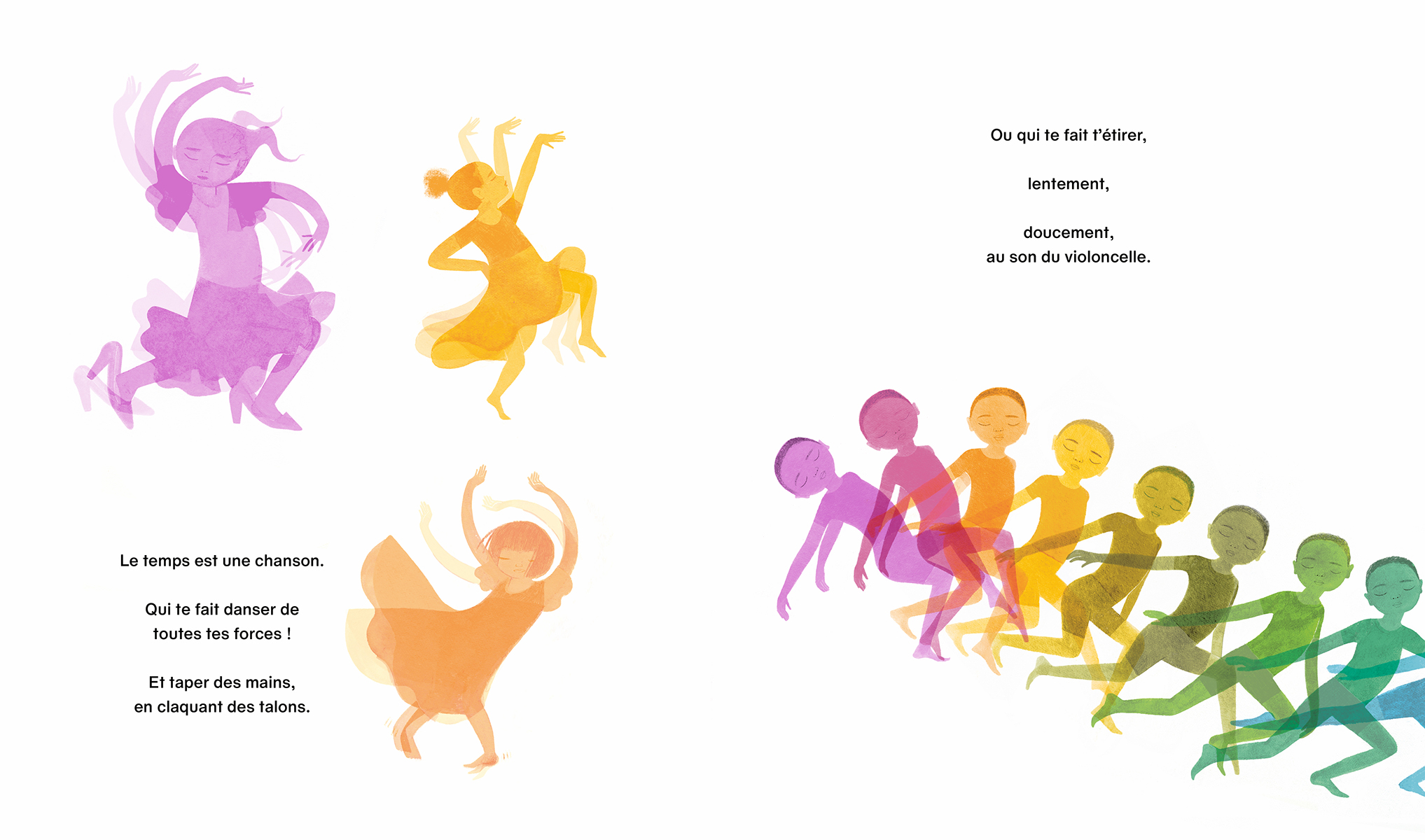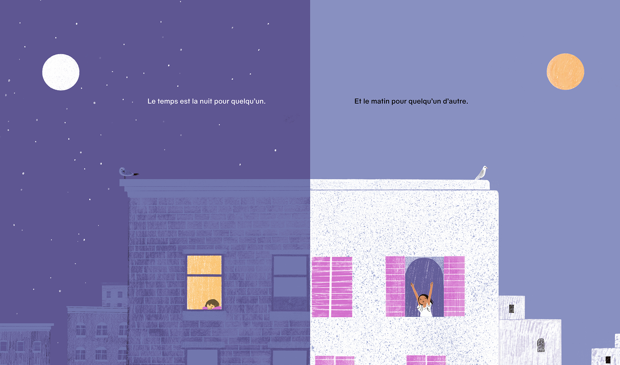Est-ce le tic-tac d’une horloge, les chiffres et les mots d’un calendrier ? Oui, mais c’est bien plus que ça. Le temps, c’est une graine qui attend de pousser, une fleur qui éclot, un rayon de soleil qui traverse une pièce. Il est lent comme une araignée qui tisse sa toile ou rapide comme une vague à la plage. Le temps, c’est une dent qui bouge, l’attente de la cloche de l’école, ou la lecture d’une histoire… ou de trois ! Mais le temps, c’est aussi le matin pour certains et la nuit pour d’autres, un coucher de soleil qui s’efface et un souvenir figé dans une photo prise il y a longtemps.