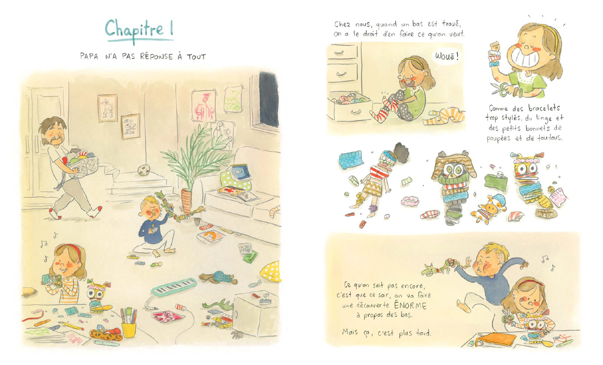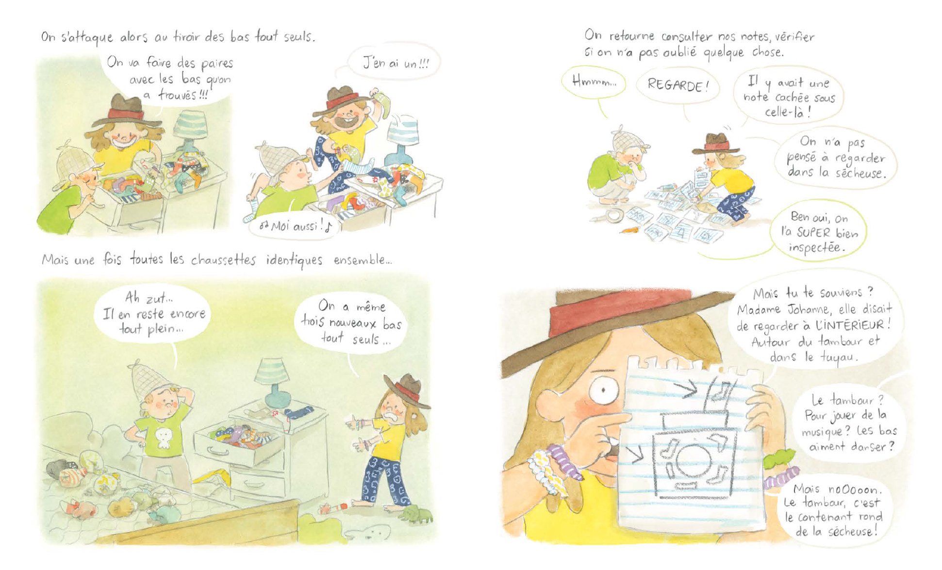 Mais où vont tous ces bas perdus? Ceux que l’on sait avoir déposés dans la machine à laver, mais qui n’en sont jamais ressortis. Sous le choc après avoir découvert un tiroir rempli de bas tout seuls dans leur maison, les jeunes Louis et Madeleine ménent une enquête. Sur leur chemin, ils interrogent leurs amis, leurs enseignants et même un chat. Certains avancent que les bas seraient mangés par le monstre de la sécheuse, d’autres que des gnomes seraient responsables de leur disparition. L’énigme ne sera pas facile à résoudre, mais le duo frère-soeur est prêt à tout pour trouver le coupable. Après le grand succès de La fin des poux?, Orbie nous revient avec un album d’enquête avec l’humour, la fraîcheur et le sens de l’observation qu’on lui connait. Après tout, qui n’a jamais perdu un bas à l’intérieur de sa propre maison sans le retrouver? Mystérieux, n’est-ce pas?