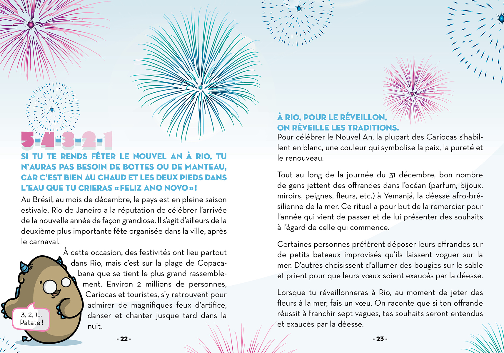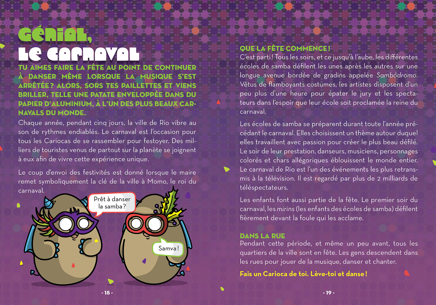 Guidés par les dragouilles, des petites patates-dragons hilarantes et espiègles, les lecteurs visiteront Rio de Janeiro, au Brésil. Les jeunes fabriqueront un masque et participeront à l’un des plus beaux carnavals du monde. Ils deviendront fous du foot et fabriqueront leur propre lance-confettis.