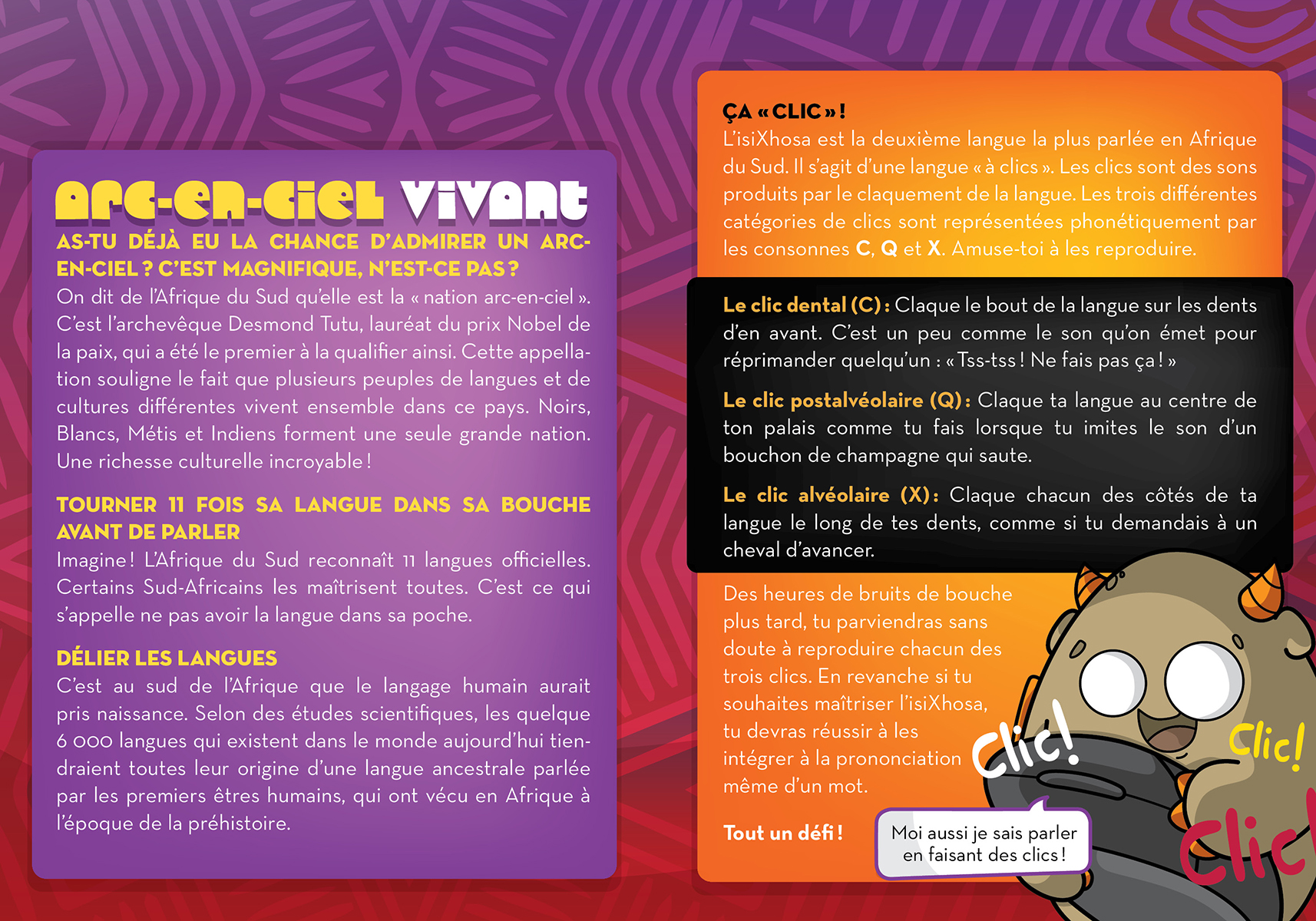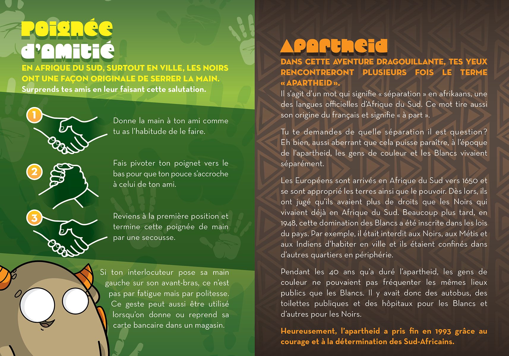 Guidés par les dragouilles, des petites patates-dragons hilarantes et espiègles, les lecteurs visiteront Johannesburg, en Afrique du Sud. Les jeunes rencontreront un esprit maléfique et cuisine un bobotie. Ils apprendront à donner une poignée d’amitié et découvriront comment les mineurs communiquaient grâce au gumboot.