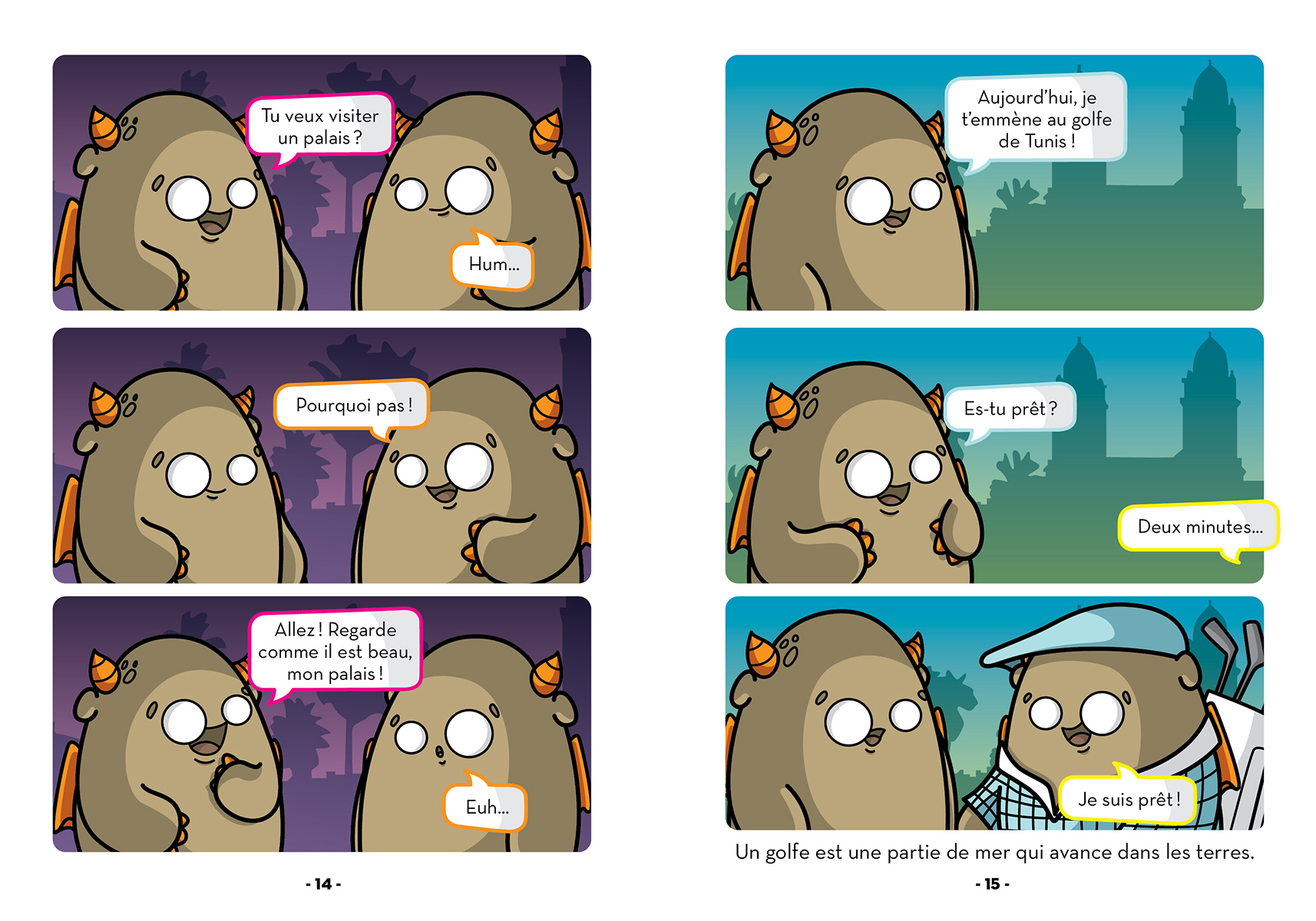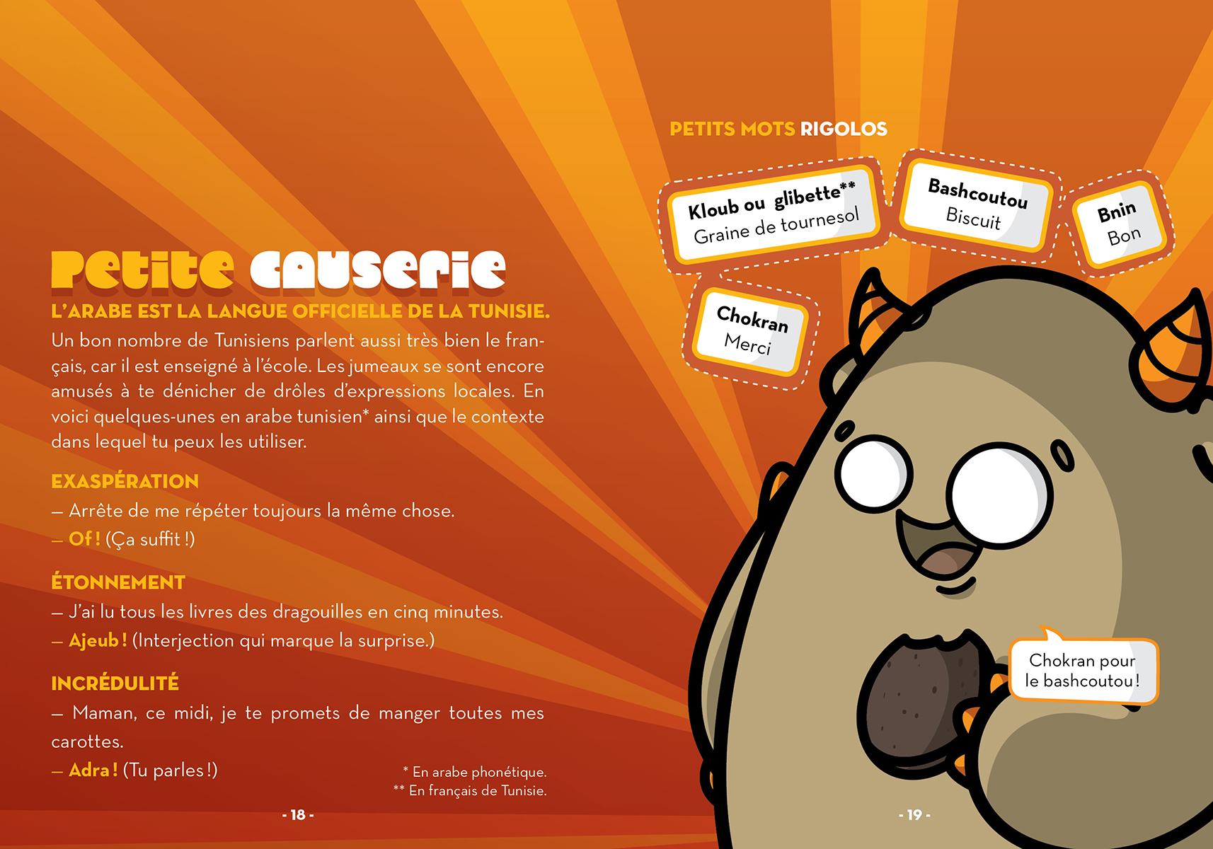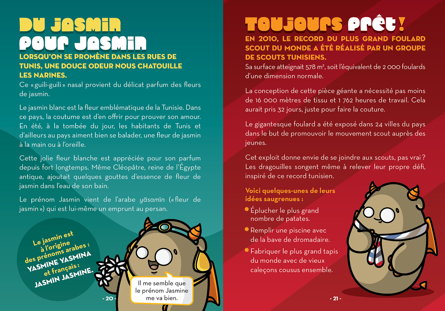 Guidés par les dragouilles, des petites patates-dragons hilarantes et espiègles, les lecteurs visiteront Tunis, en Tunisie. Les jeunes pénétreront dans la médina et plongeront dans l’univers unique des souks. Les dragouilles leur enseigneront l’histoire des chéchias, leur feront capturer un arc-en-ciel et leur apprendront comment contrer le mauvais œil.