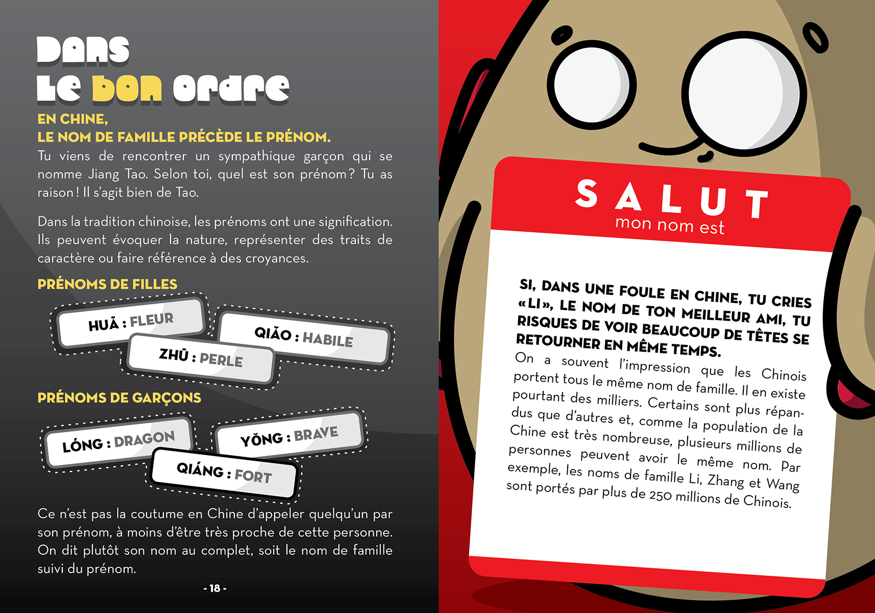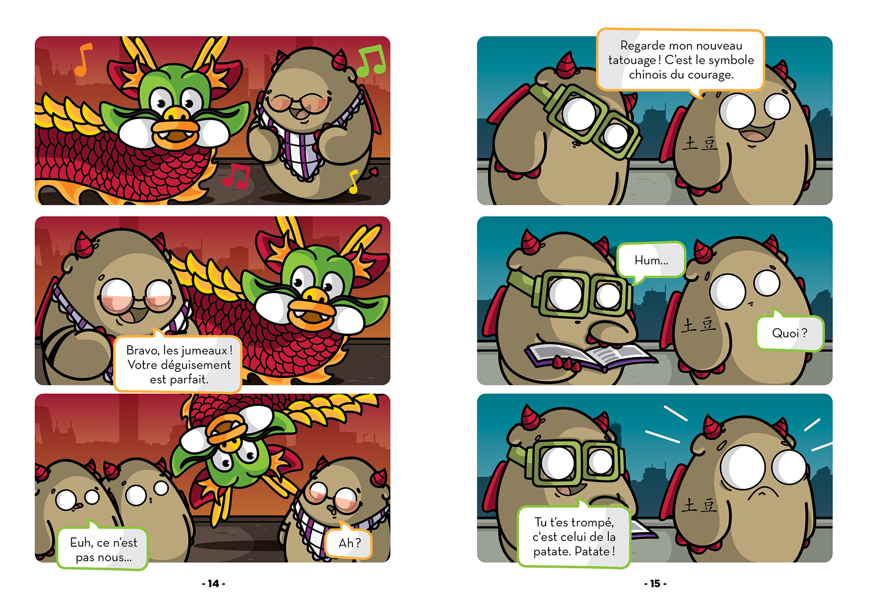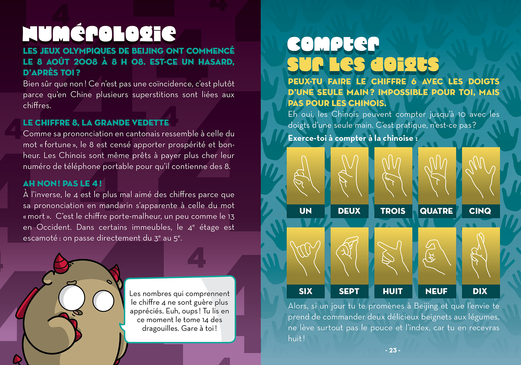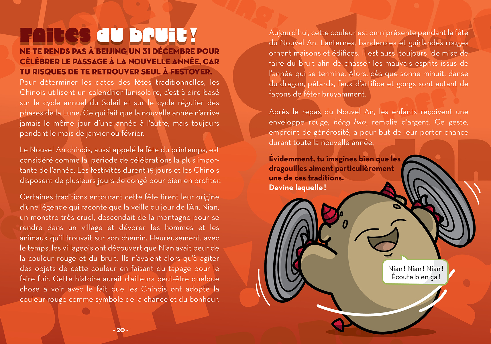 Guidés par les dragouilles, des petites patates-dragons hilarantes et espiègles, les lecteurs visiteront Beijing, en Chine. Les jeunes découvriront la légende du monstre Nian et devineront pourquoi, en Chine, 4 est le plus mal aimé des chiffres. Ils pourront s’exercer à compter sur tes doigts à la chinoise et admireront le chef-d’œuvre d’ingéniosité qu’est la Grande Muraille de Chine.