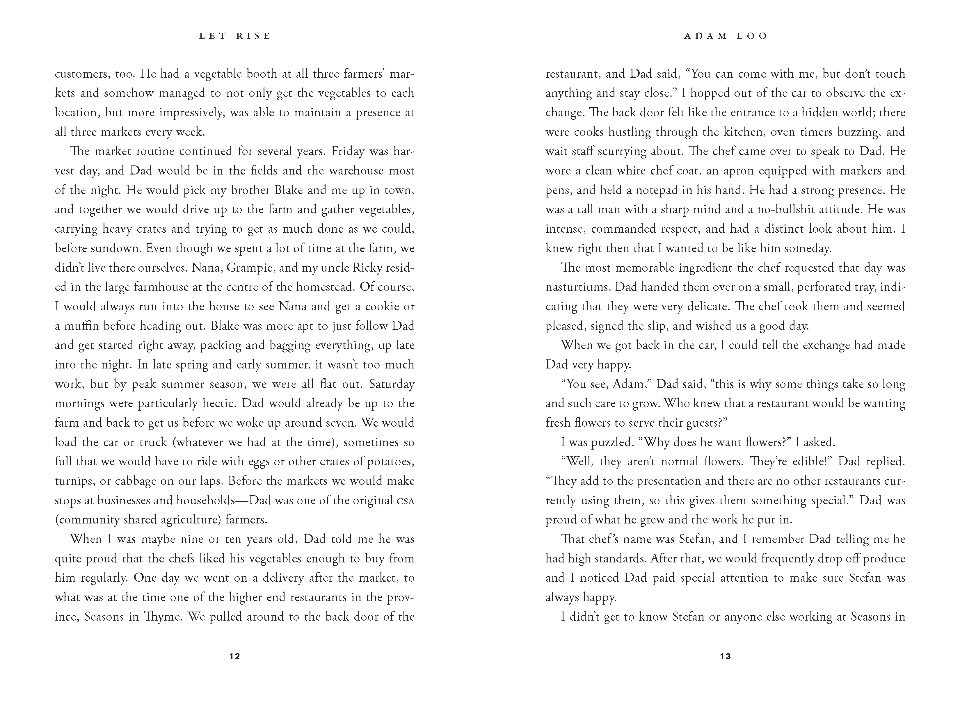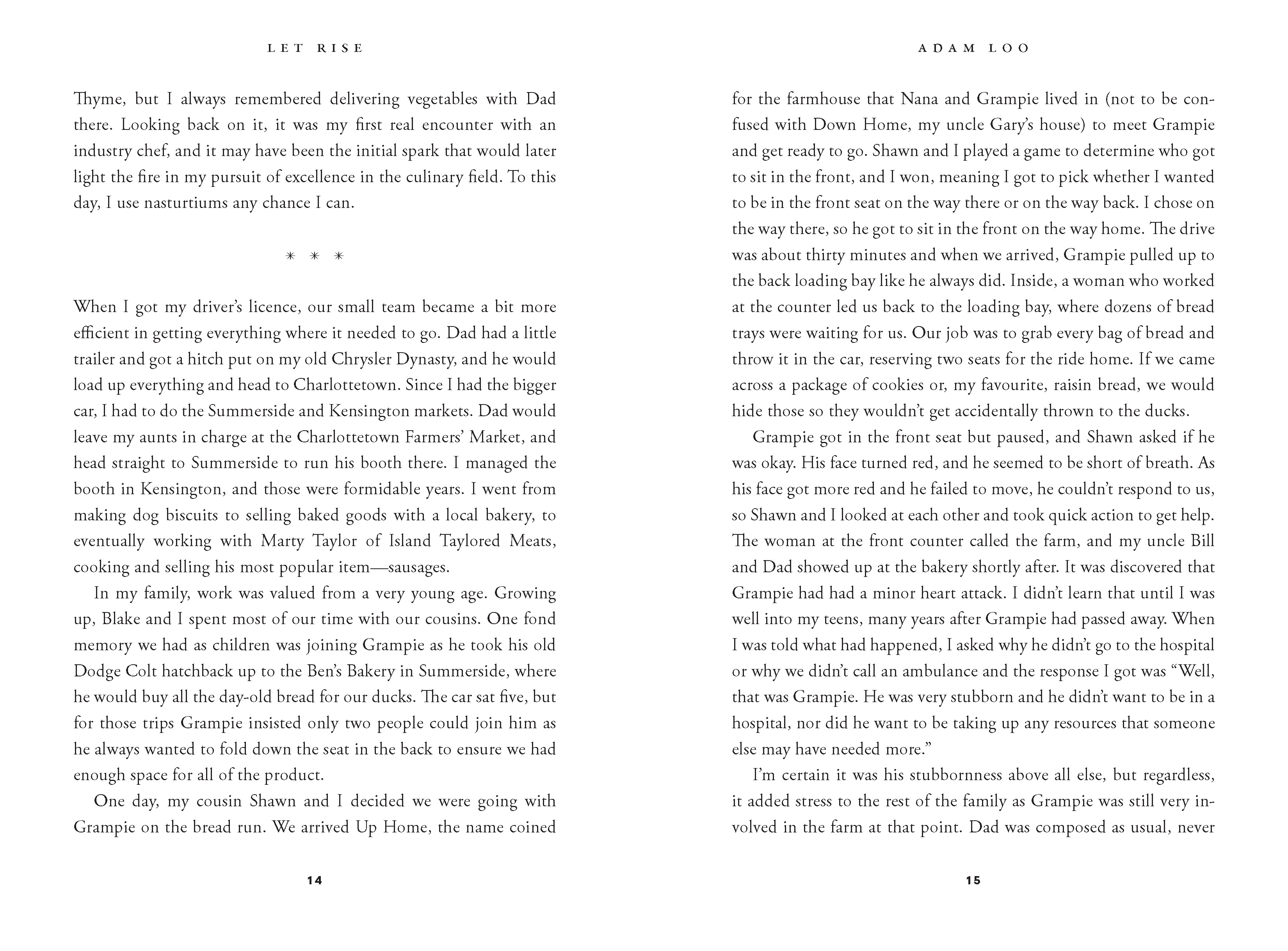 In Let Rise, Adam Loo takes readers on an exhilarating journey from growing up in a family farm to establishing his own unique farm-to-table business in the heart of his home province of Prince Edward Island. Setting out on a journey of entrepreneurship not for the faint of heart, Adam shares lessons he learned through culinary school; and his culinary Olympic team journey, all the while navigating the losses of his father, brother, and more.
