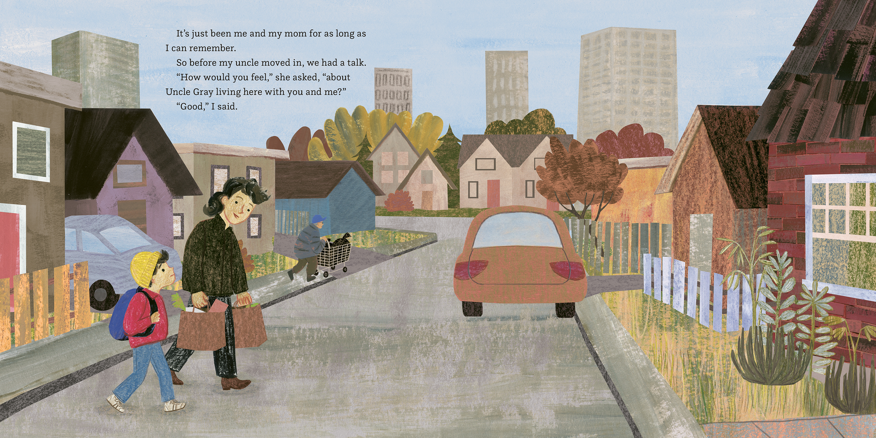 His nephew stands waiting for him out on the porch, and when Uncle Gray arrives, the boy is surprised his uncle only has one little backpack. Uncle Gray has been living on the streets for years, and the boy remembers how he and his mom used to go driving to look for him, especially during the winter. Sometimes they'd find him in his tent, with ice in his beard. He was always glad to see them. Now that Uncle Gray is ready to move in, he'll have his own cozy room, and the boy is glad to know they won't have to go looking to check if he's okay. Because he'll be right downstairs.