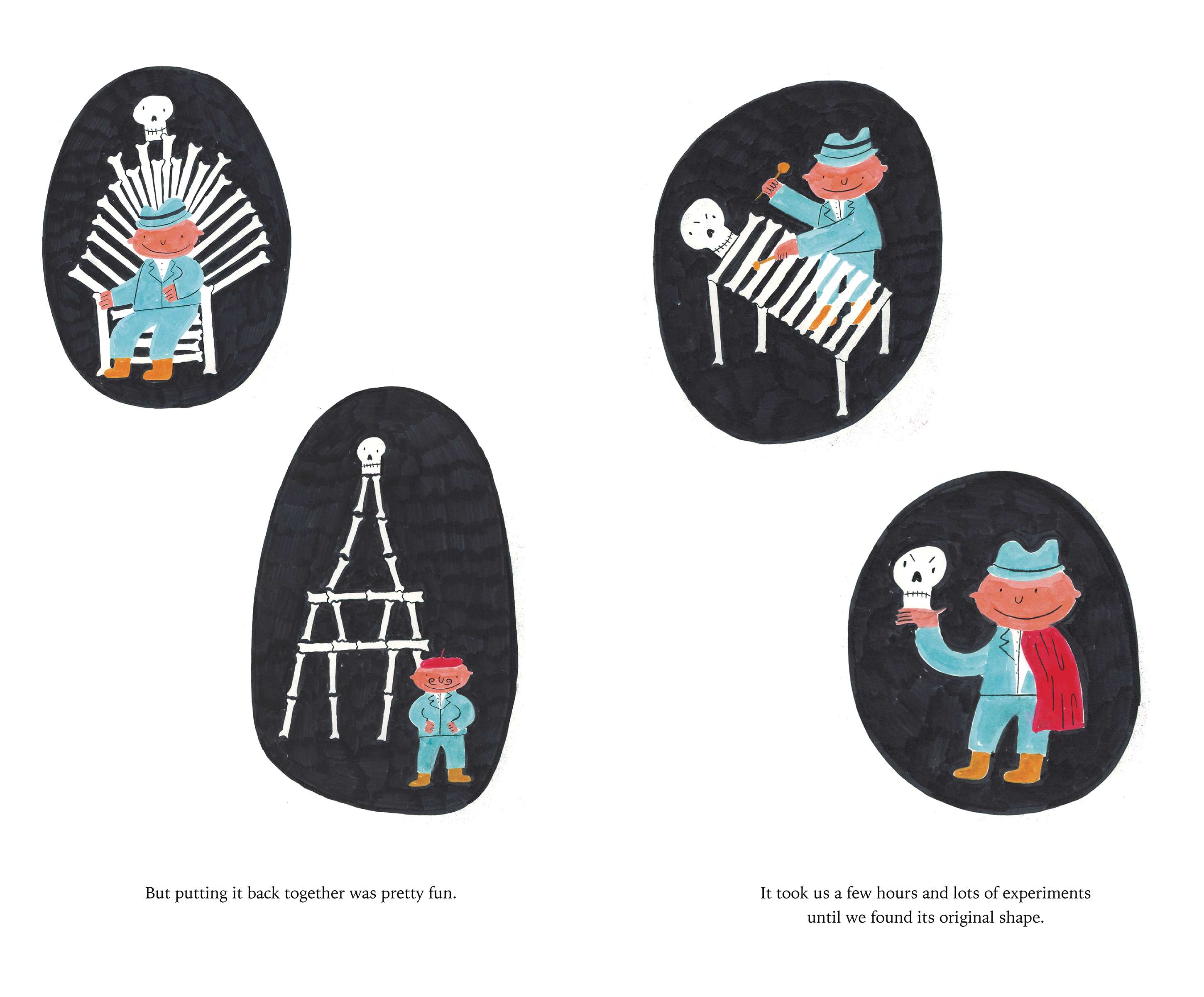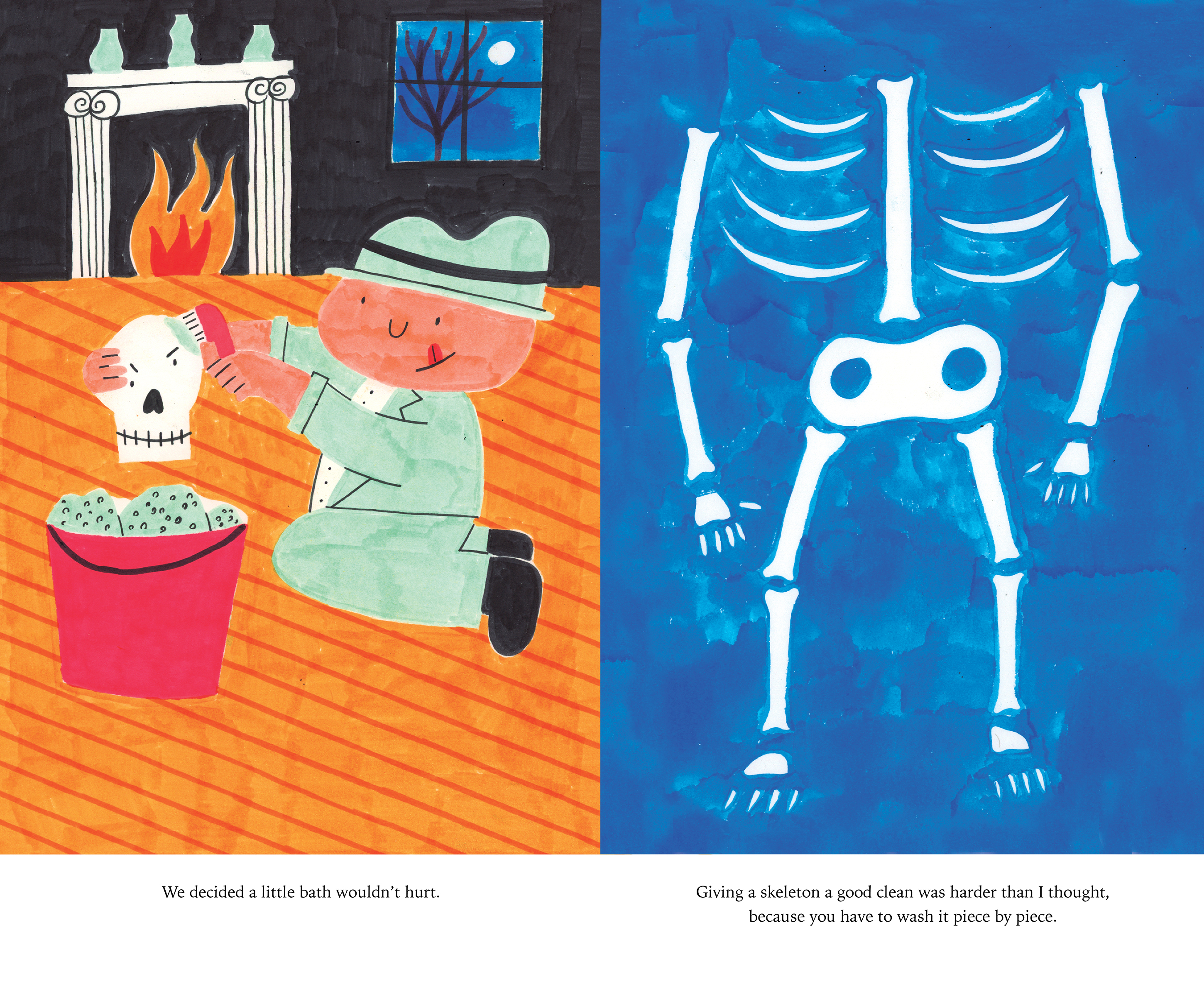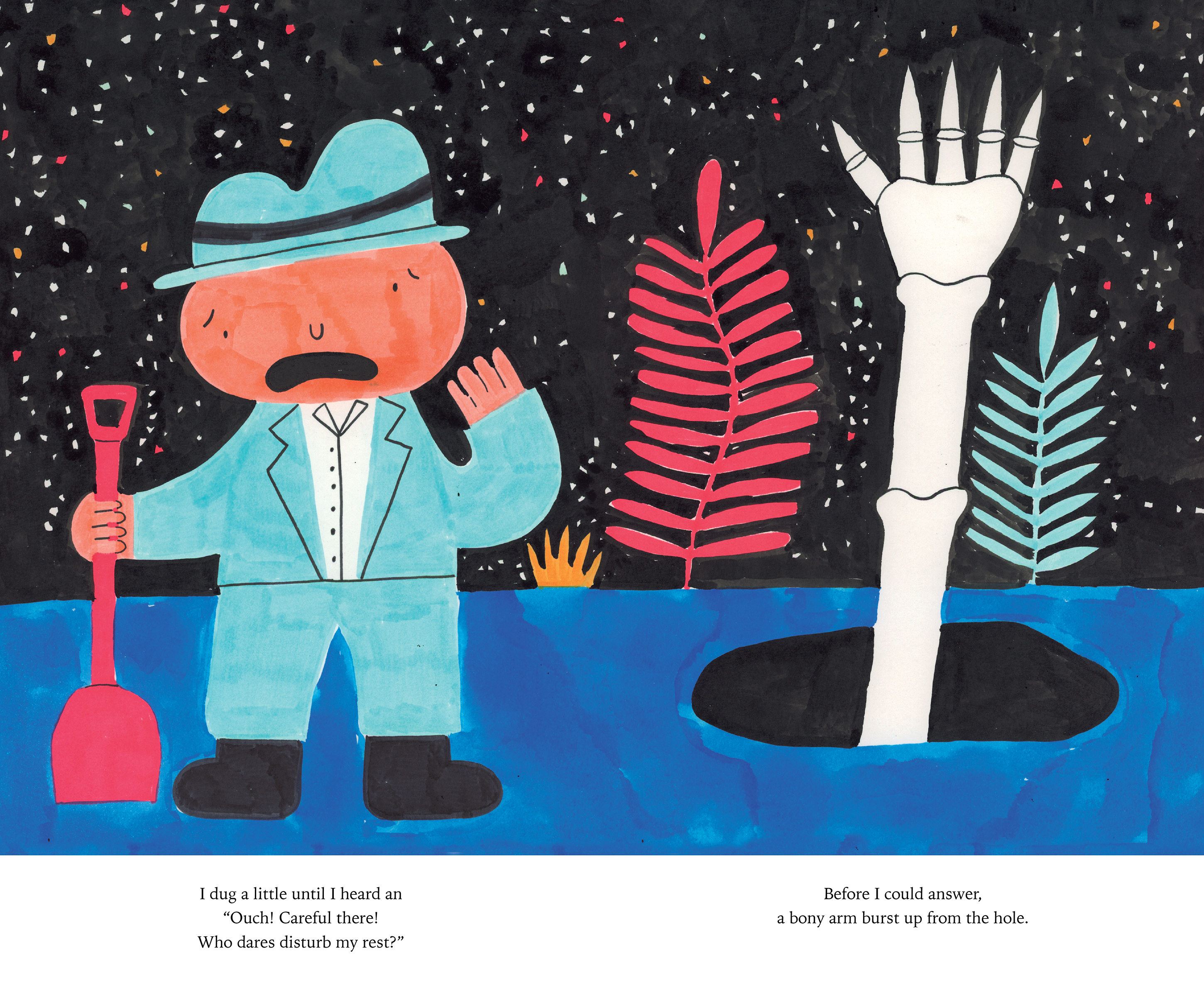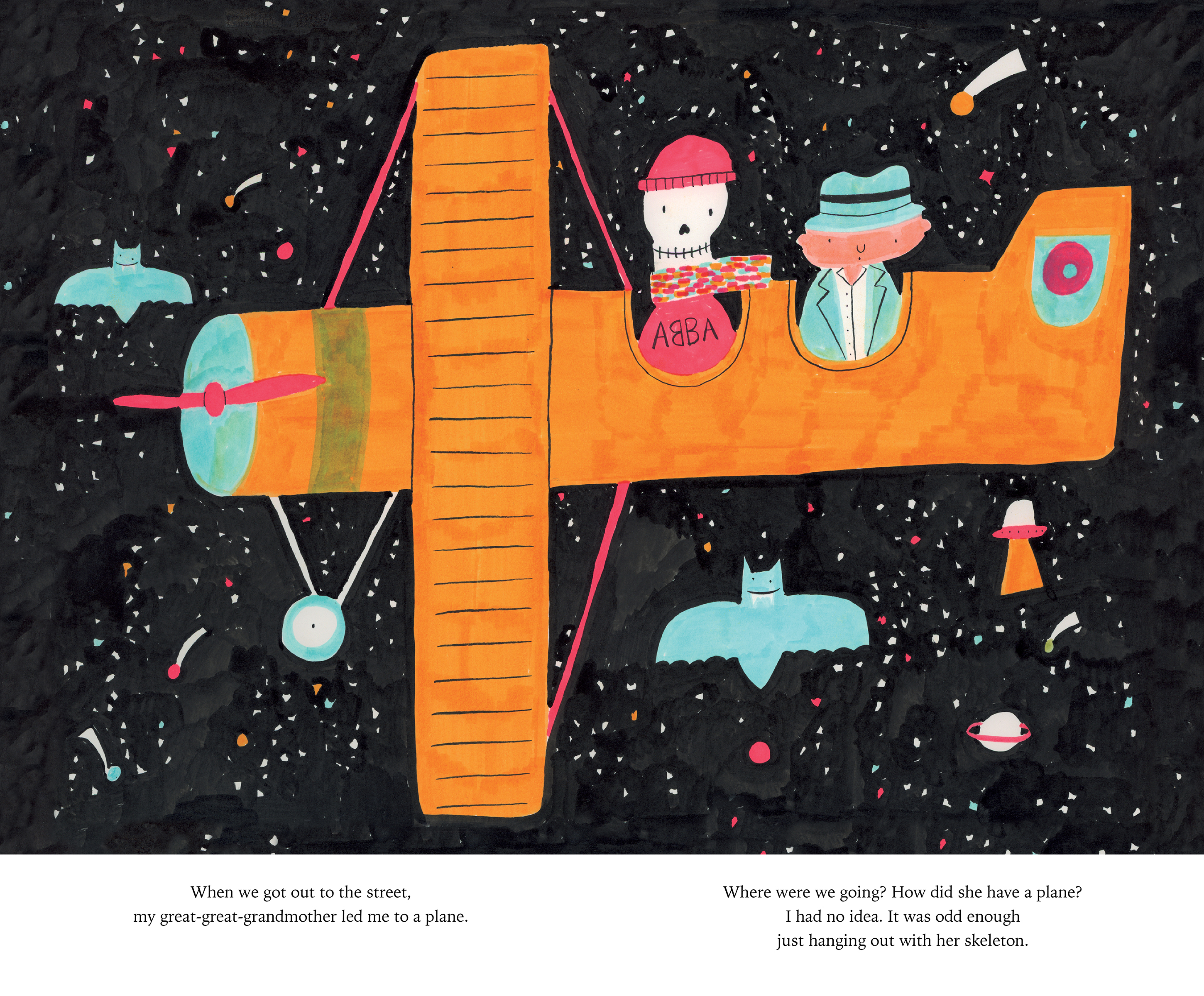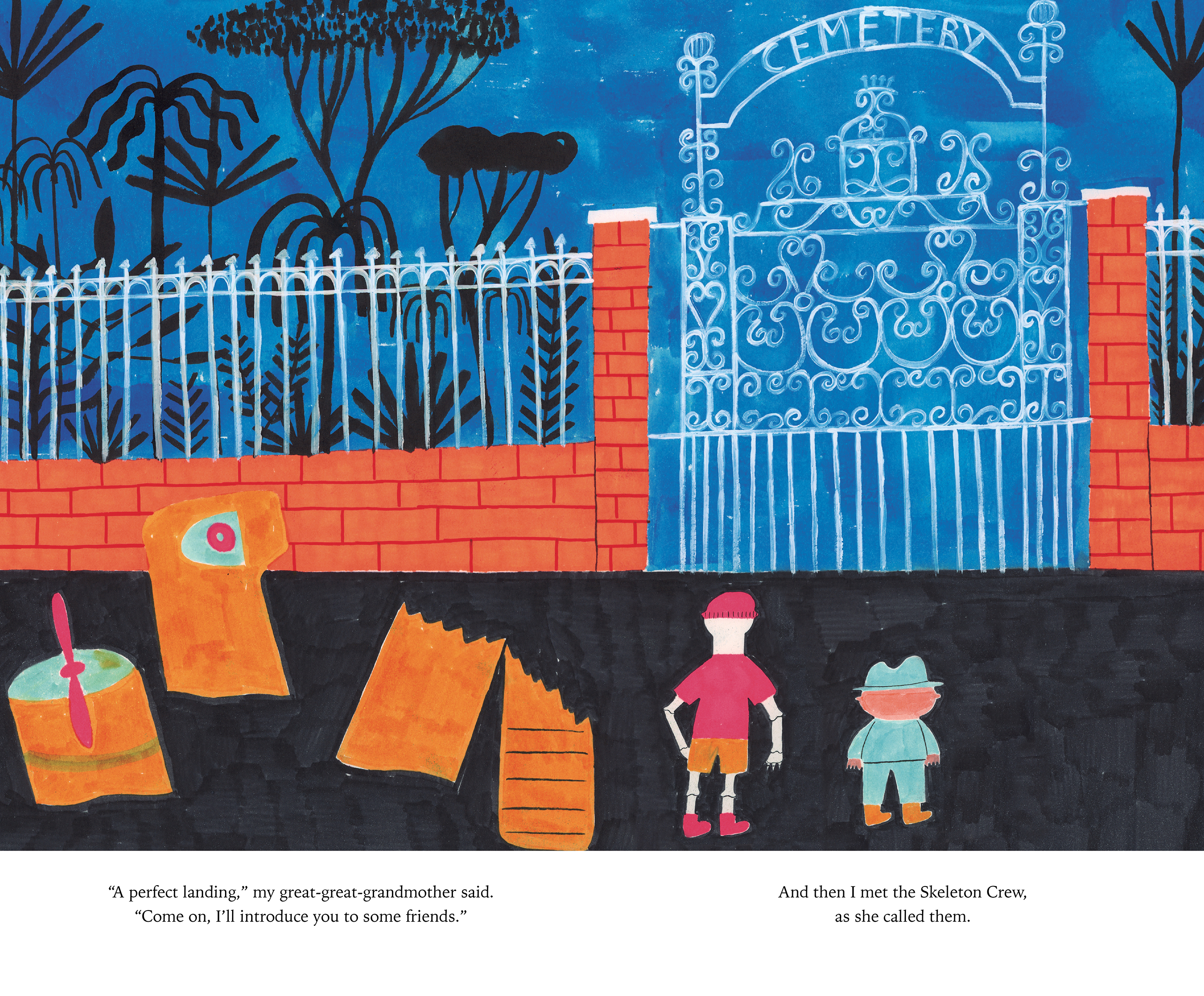 What he’s not expecting to find is the skeleton of his great-great-grandmother! She scolds him for not recognizing her. Also, she might smell a bit. It takes time to clean all the bones, and even more to put her back together. Then it’s time for Great-Great-Grandmother and the boy to go exploring. Where did she get that airplane? Or that motorcycle? After their joyrides and partying all night, Great-Great-Grandmother only has one last request: a tasty glass of lemonade. At last, she’s ready to go back to her final resting place. But the boy will never forget the time they spent together or the feeling of making his great-great-grandmother proud.