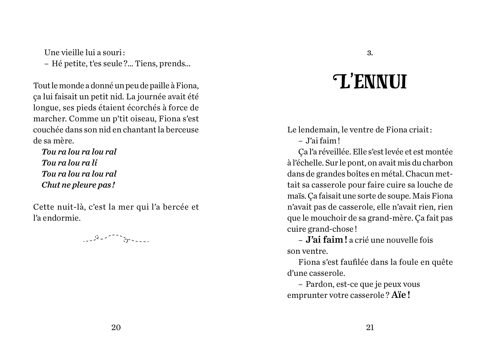 Fiona fuit la famine qui ronge son île verte, l’Irlande. Pieds nus, le mouchoir de sa grand-mère comme seul bagage, elle s’embarque pour le Canada. Sur le bateau, la vie n’est pas rose. La cale est noire, puante et les rats lui passent sur le corps ! Au cours de la traversée, Fiona découvre des passagers clandestins, ce sont des Fairies, des créatures magiques. Mais leur magie est menacée et Fiona doit plonger dans leur monde pour essayer de leur sauver la vie.