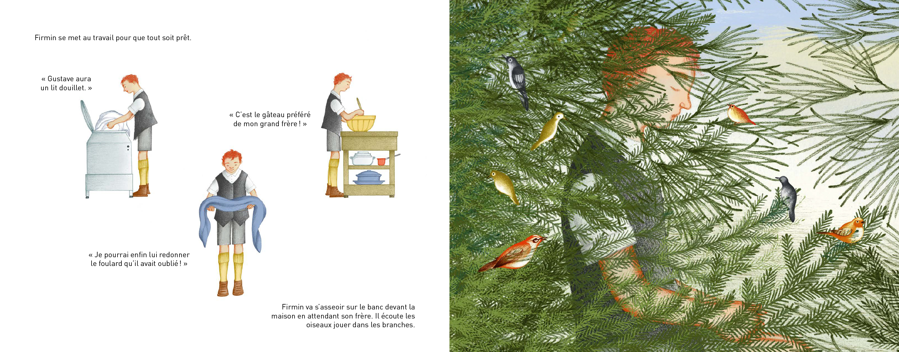 Avec Ouvrir grand ses oreilles, Céline Claire propose un personnage positif et fort atteint de cécité. Le lecteur découvre cette réalité seulement à la fin de l’album. Il y a donc un réel plaisir à relire le livre en entier pour voir comment l’autrice a mis les sons et les voix au coeur même de son écriture. L’album présente une riche structure répétitive et aborde plusieurs thèmes d’importance outre la cécité, soit la relation entre frères, les souvenirs et l’entraide. Marie Lafrance place le récit dans une époque d’antan, ce qui ajoute à l’universalité du propos. Voici un album pour créer des élans de solidarité!