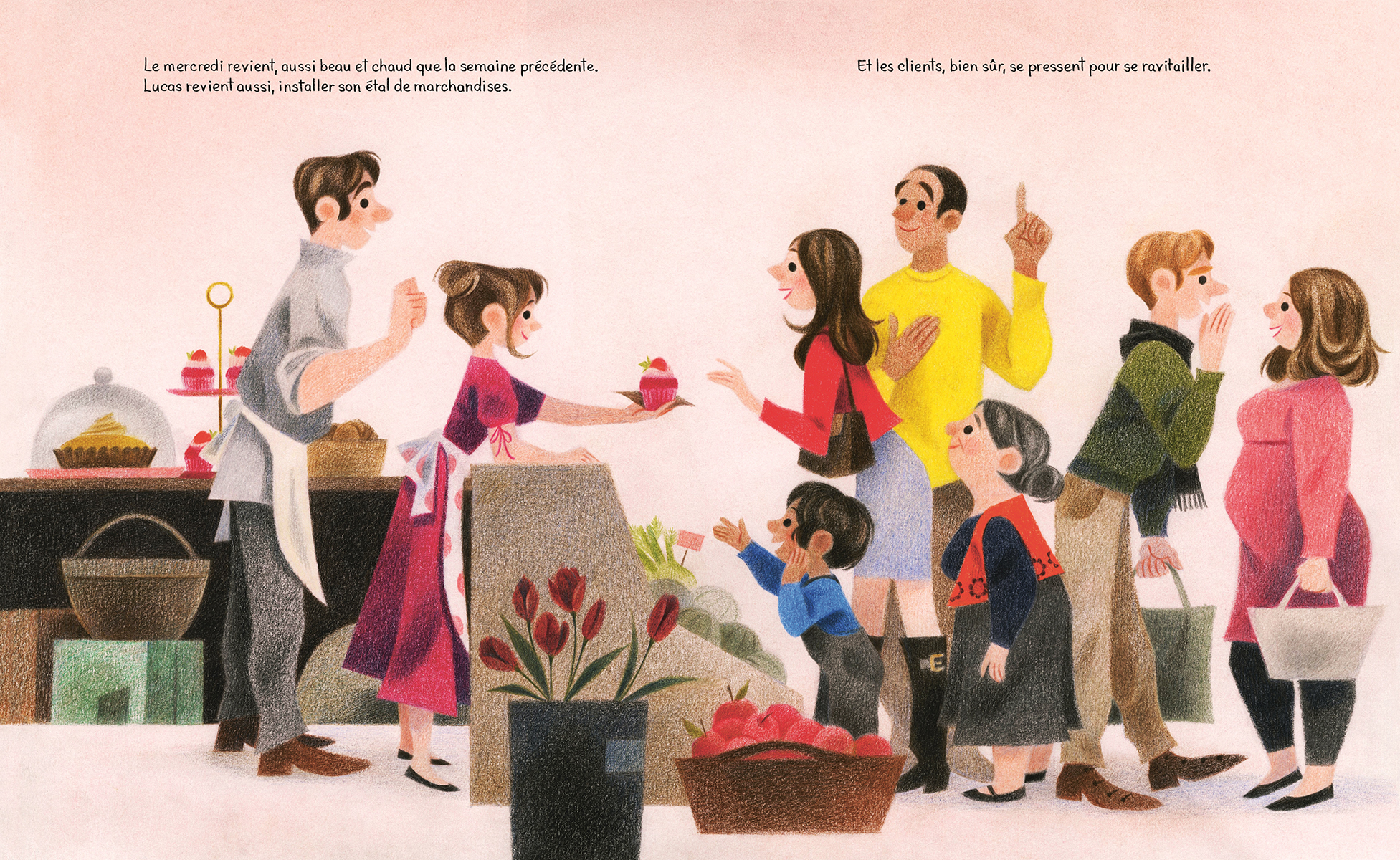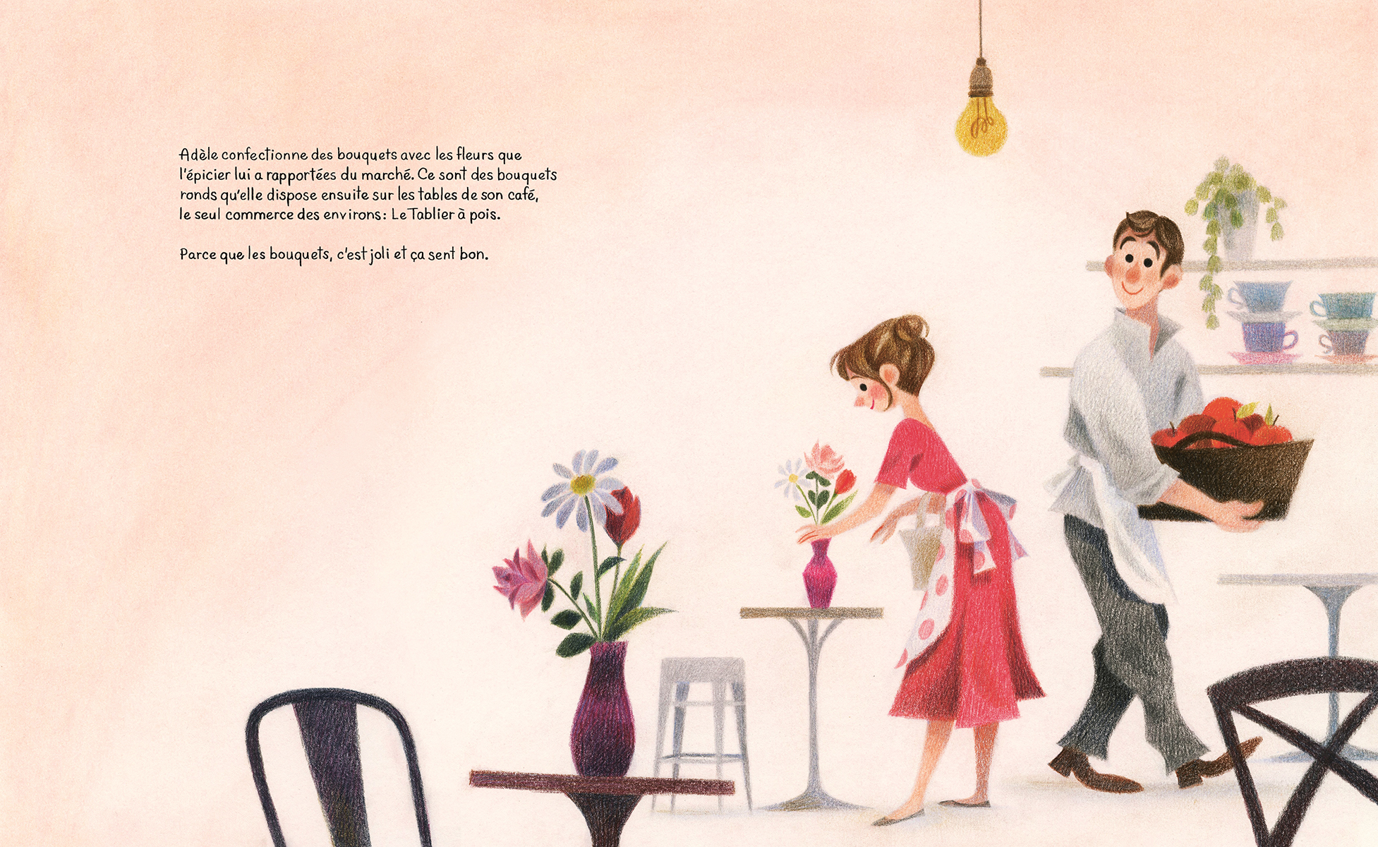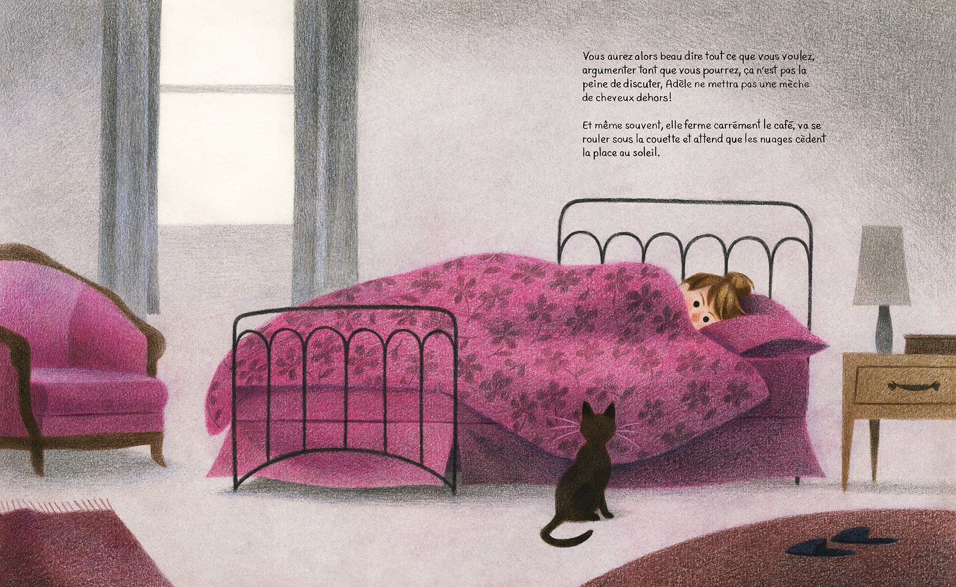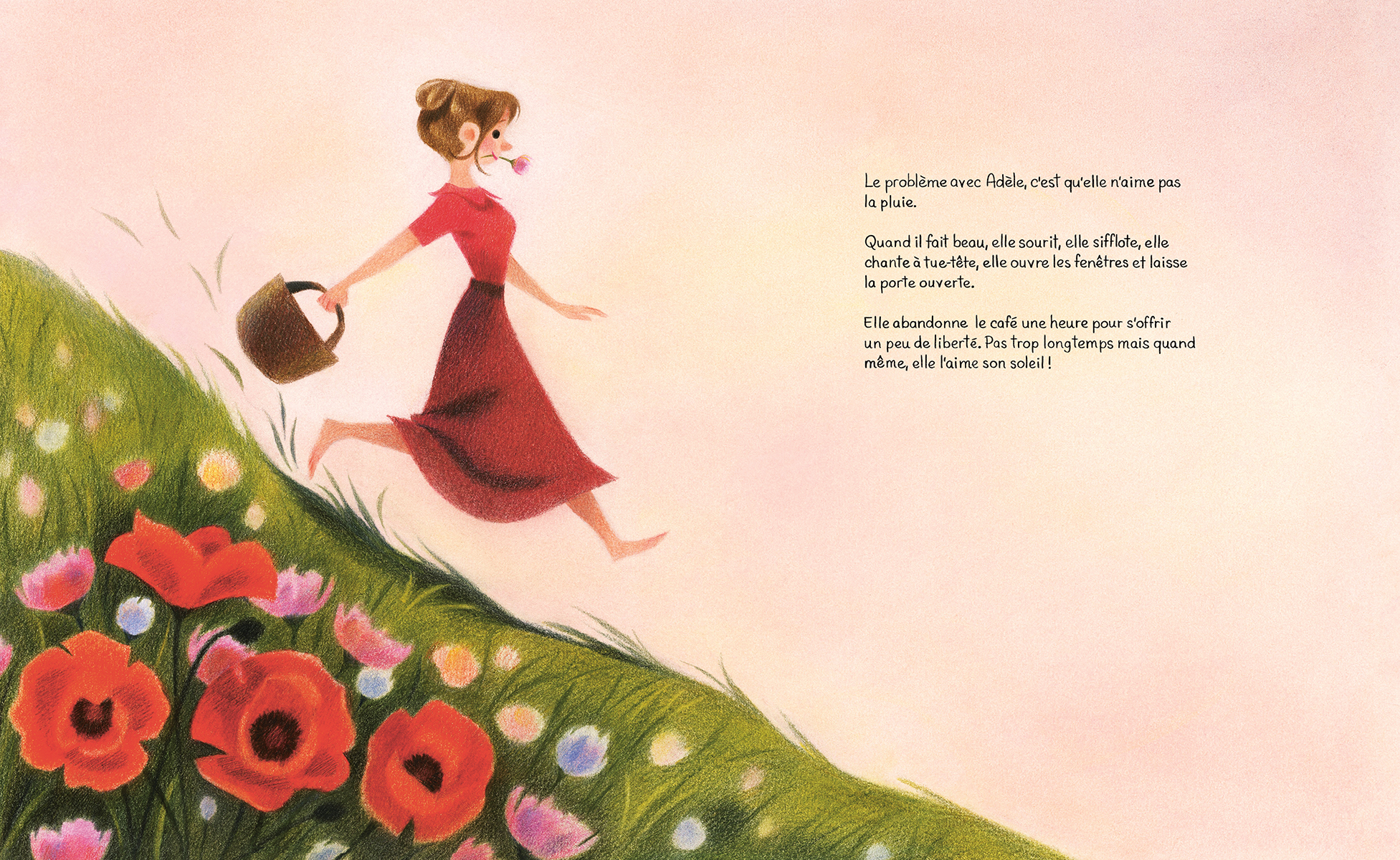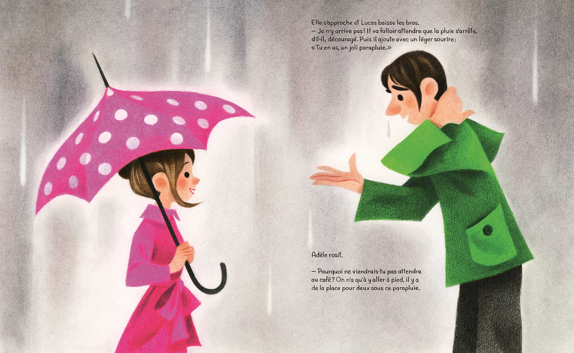Quand le soleil brille, Adèle est le cœur de sa communauté, accueillant chaque client de son café à bras ouverts. Mais lorsqu’il pleut, elle ne peut s’empêcher de rester chez elle, blottie sous les couvertures. Comme Adèle prend si bien soin de ses amis et de ses habitués, l’un d’eux décide à son tour de prendre soin d’elle. Petit à petit, il lui laisse de petits cadeaux qui l’aideront à retrouver la joie même les jours gris et pluvieux...