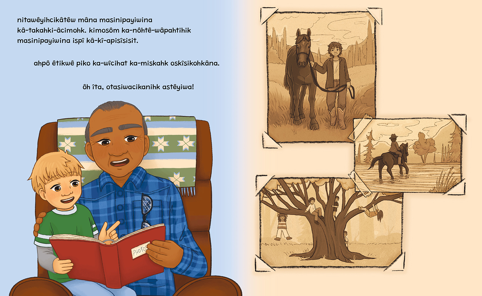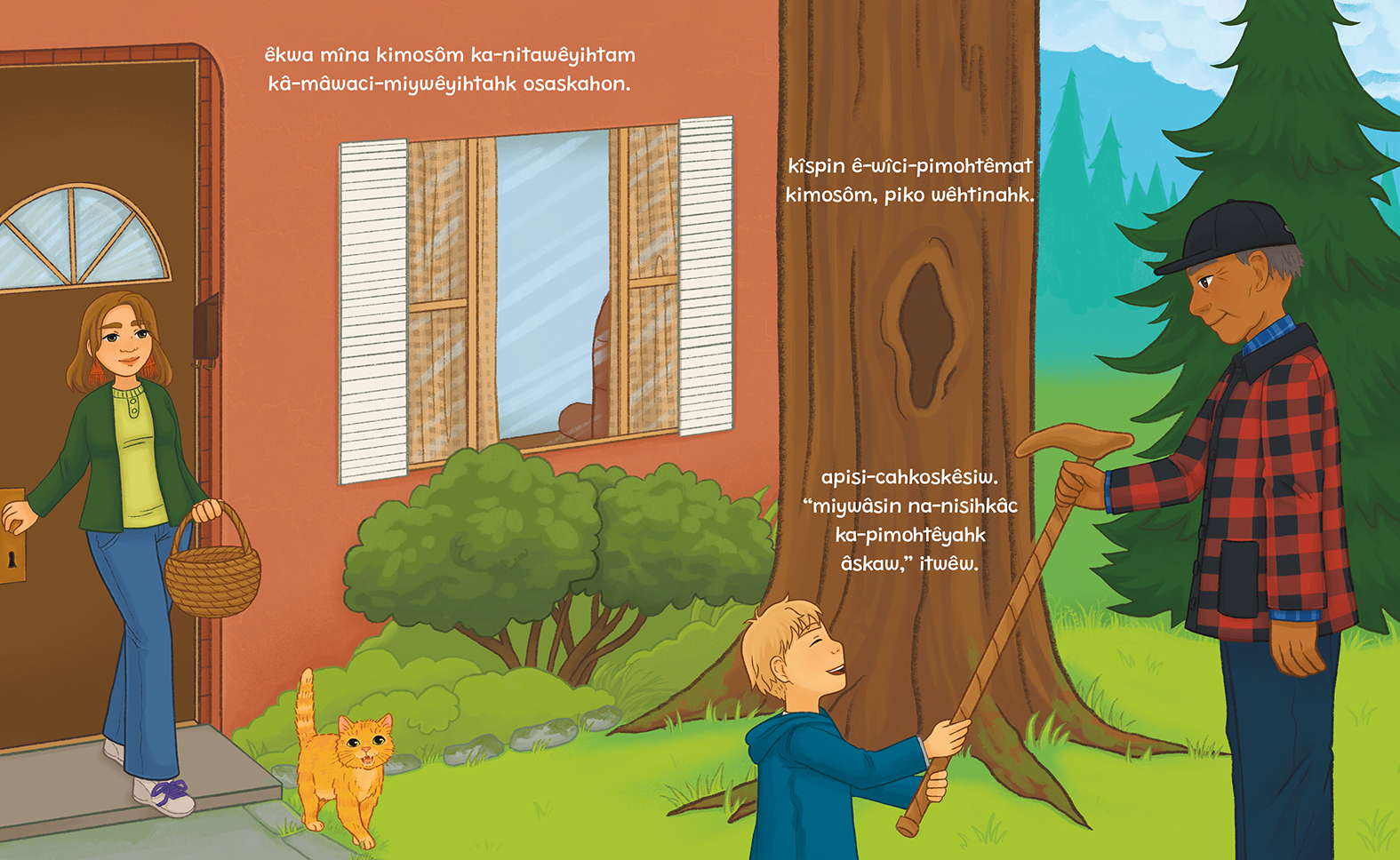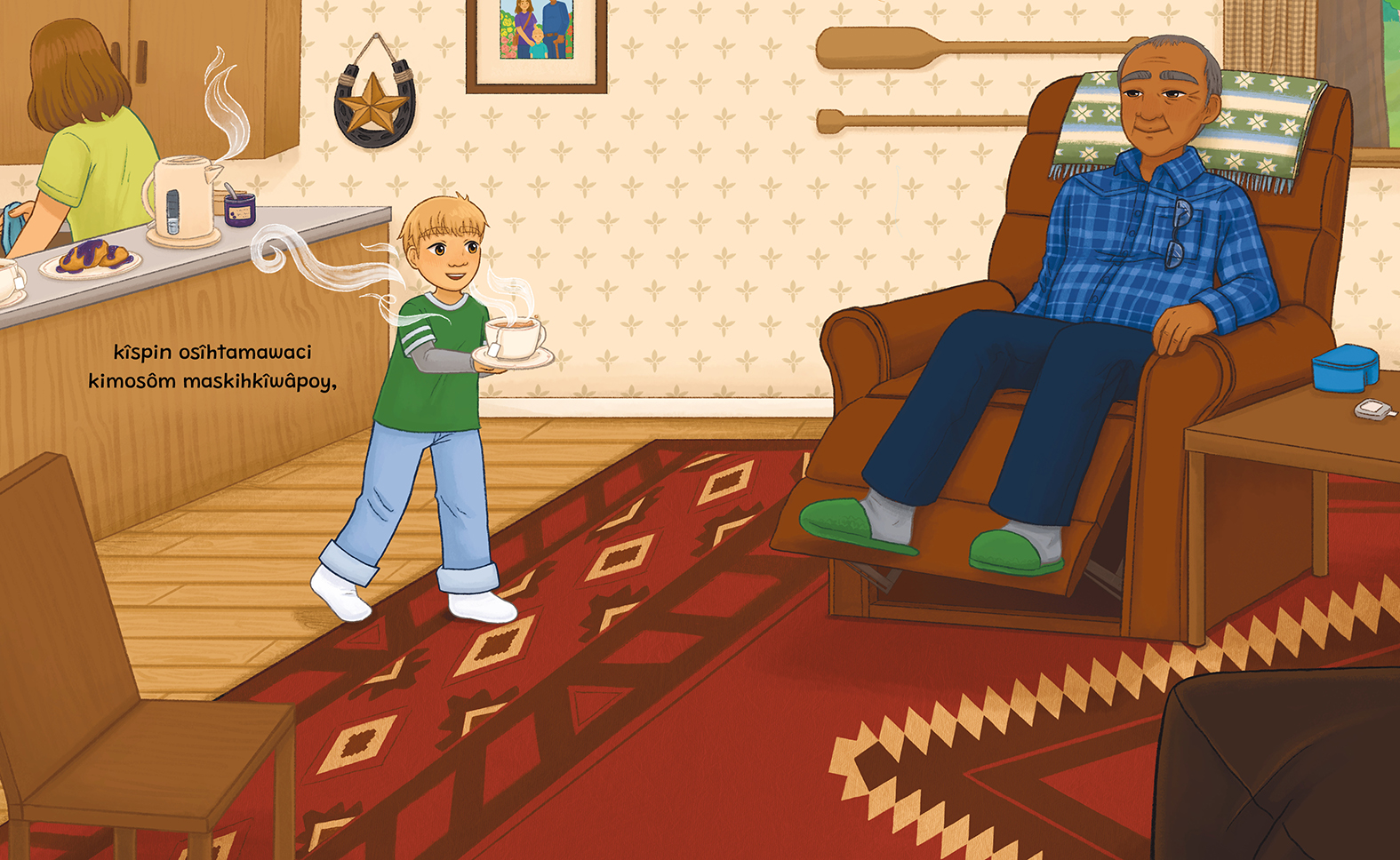 If you make him tea, chances are that he will want some bannock to go with it. He will tell you his stories, show you pictures from when he was young and share his Knowledge. Although Mosom may move a little slower and sometimes forget things, you can help him find his glasses and go for walks together. It’s okay to go slow. Along the way, Mosom will teach you new Cree words and the best places to find delicious saskatoon berries. And when you're back home again, Mosom might just ask you to make him another cup of tea.