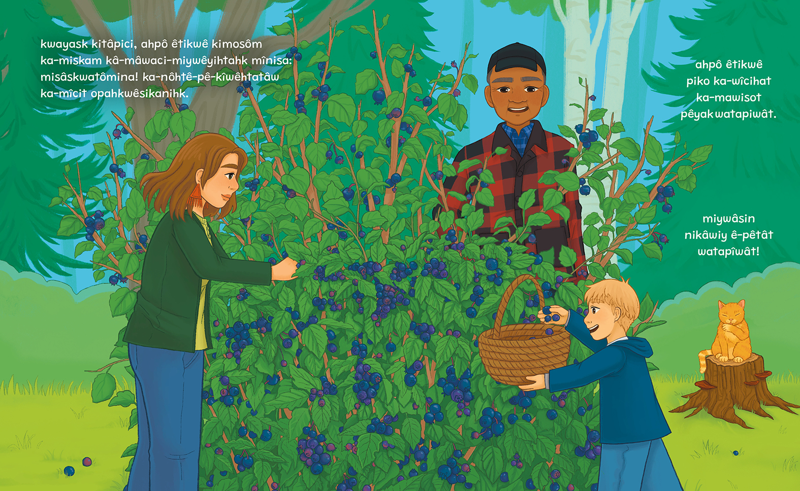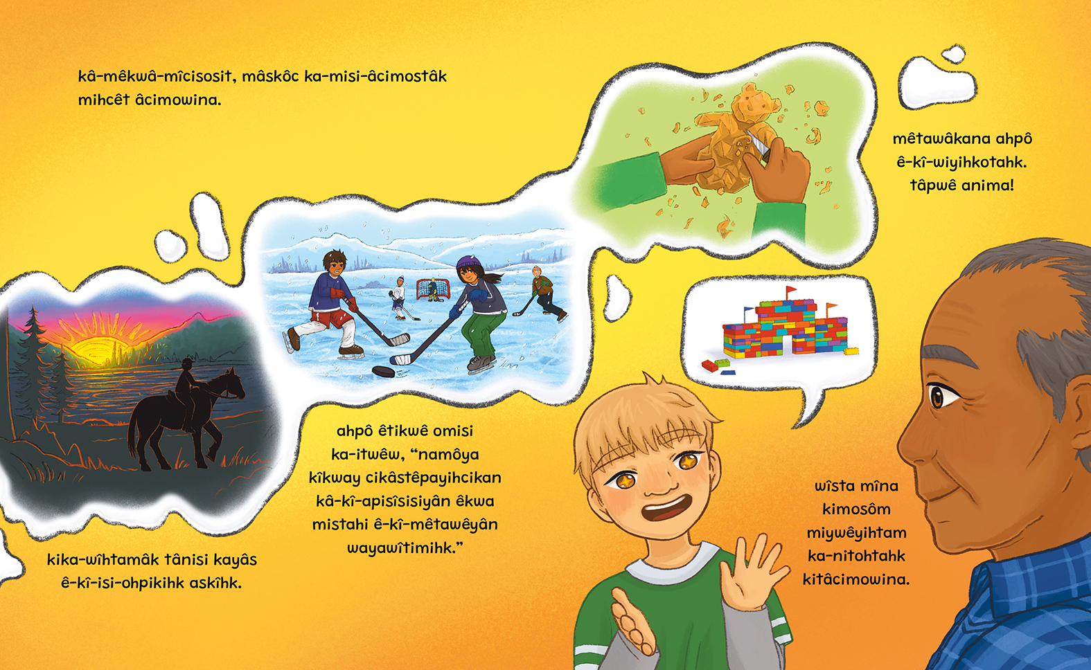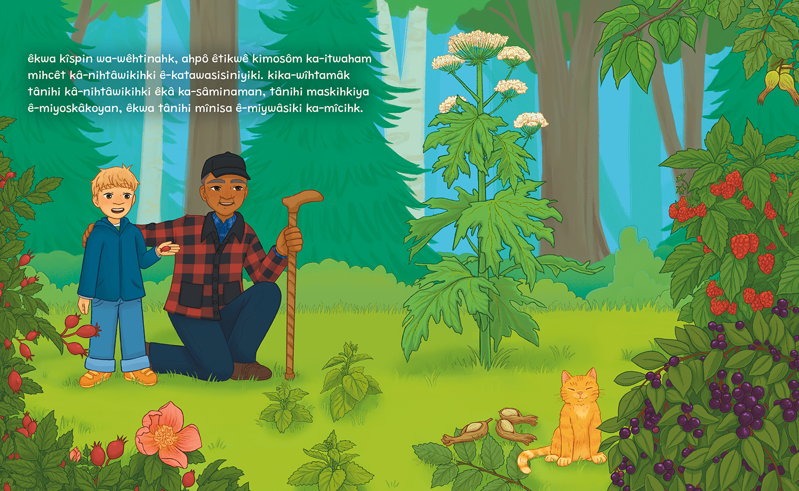 If you make him tea, chances are that he will want some bannock to go with it. He will tell you his stories, show you pictures from when he was young and share his Knowledge. Although Mosom may move a little slower and sometimes forget things, you can help him find his glasses and go for walks together. It’s okay to go slow. Along the way, Mosom will teach you new Cree words and the best places to find delicious saskatoon berries. And when you're back home again, Mosom might just ask you to make him another cup of tea.